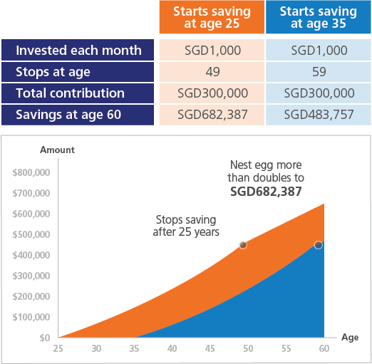And it becomes more powerful when given more savings to work with. Someone who puts aside SGD1,000 each month from the age of 35 can end up with nearly half a million by the time 60 rolls around. But someone who starts saving even earlier, at the age of 25, has the benefit of time to more-than-double the nest egg to SGD682,387. Not shabby at all!