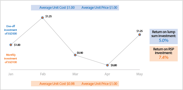 It takes the stress out of investing, as investors do not have to decide if the fund is expensive or not, and if market conditions are right to invest. Each month, the money goes like clockwork into pre-determined investments. Doing so can smooth out price bumps, and result in a lower average unit cost. At DBS, such plans can be put in place from as little as SGD100* a month.