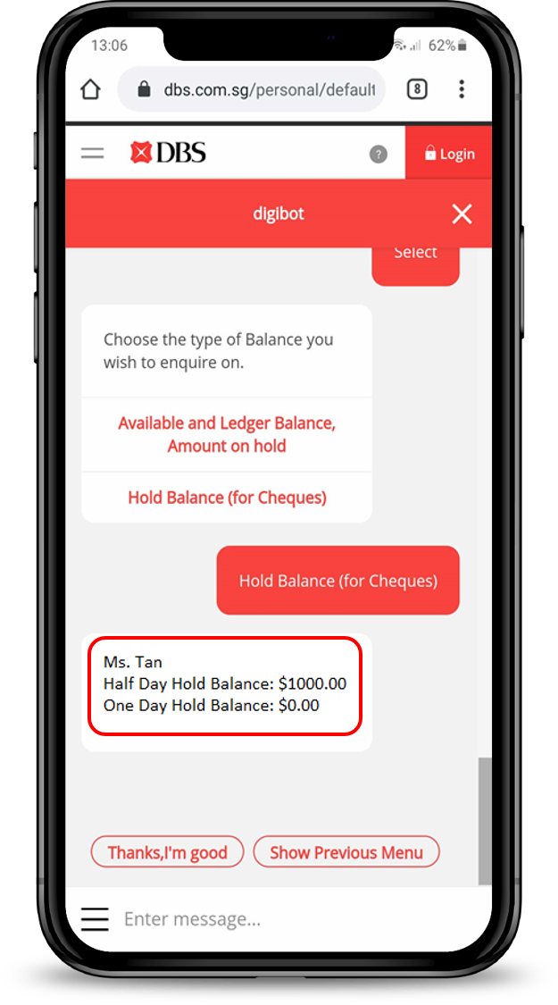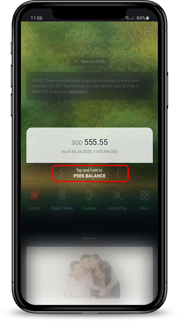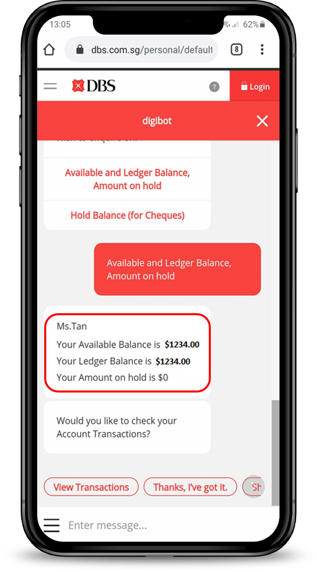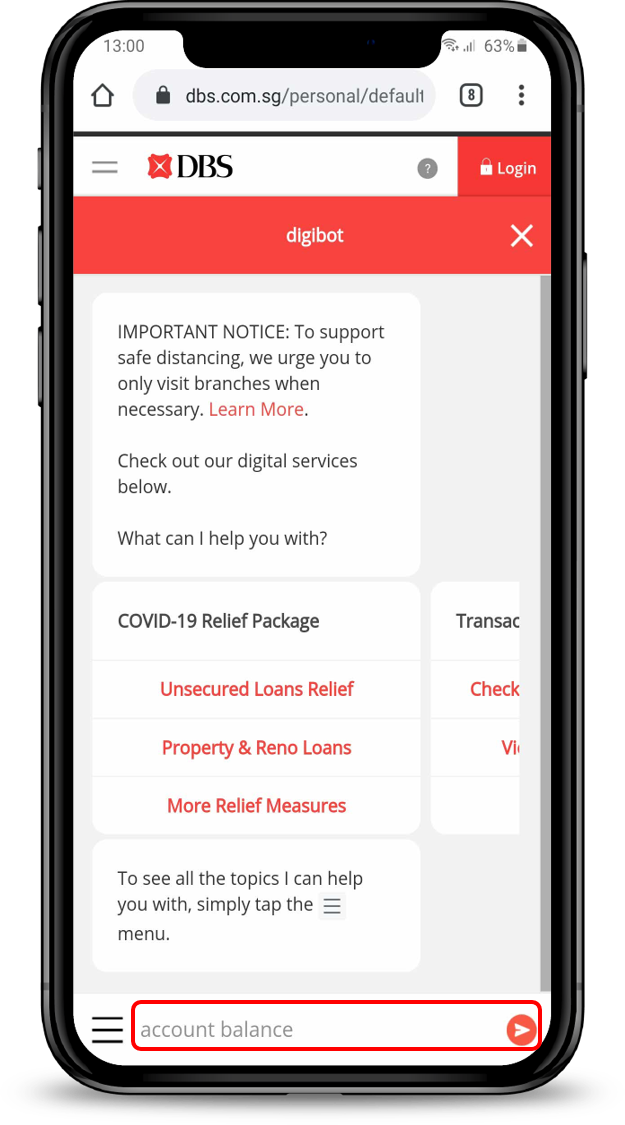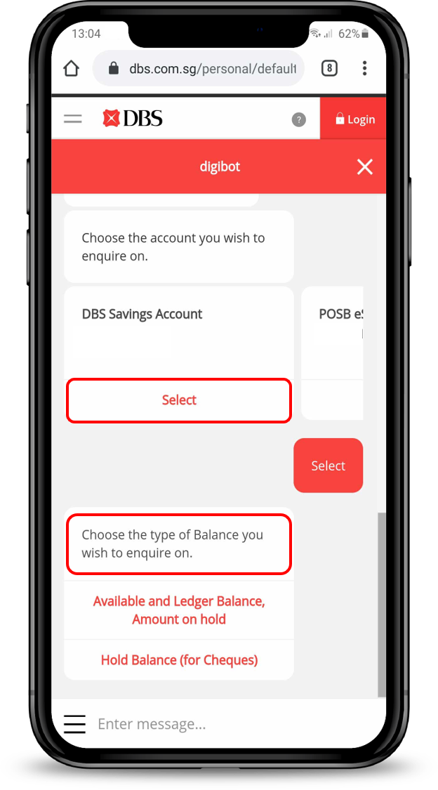 You can check your account balance using DBS Digibot, digibank (setup Peek Balance via digibank mobile to skip login), Phone banking or at DBS/POSB ATM.