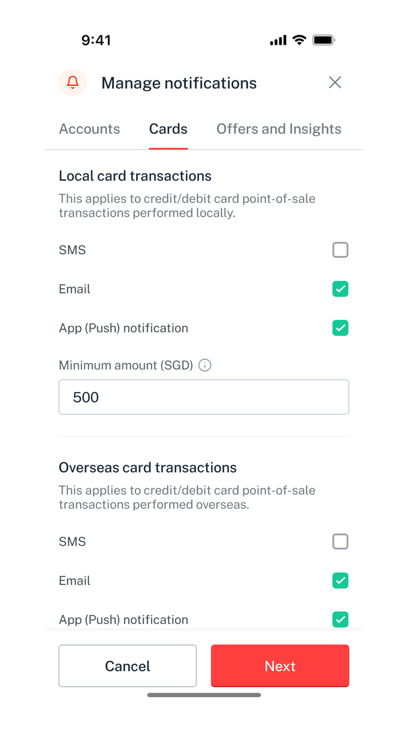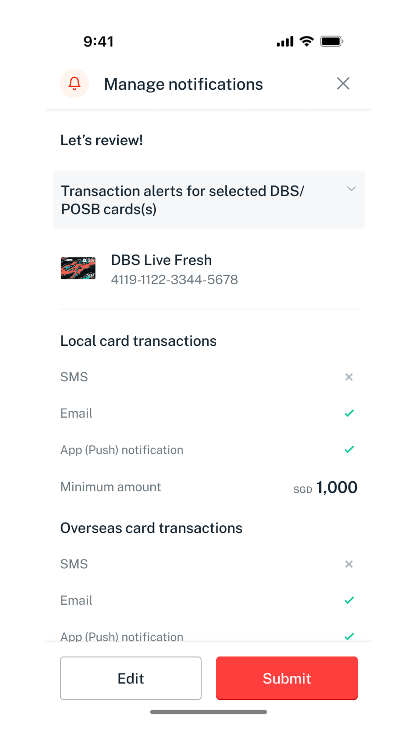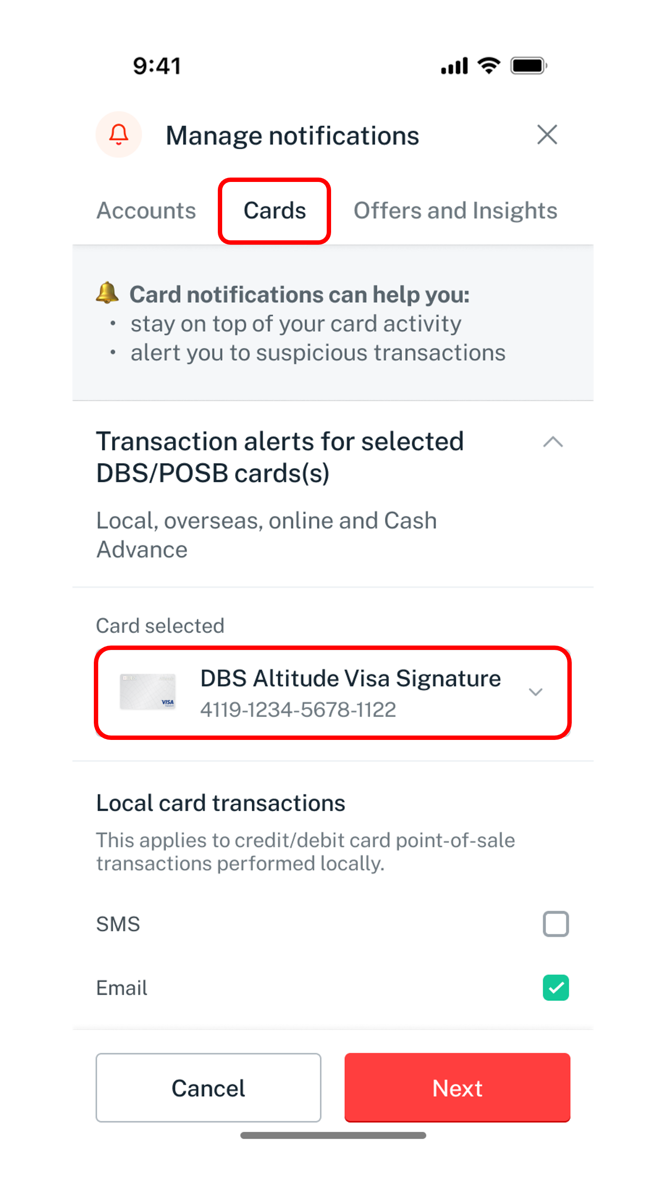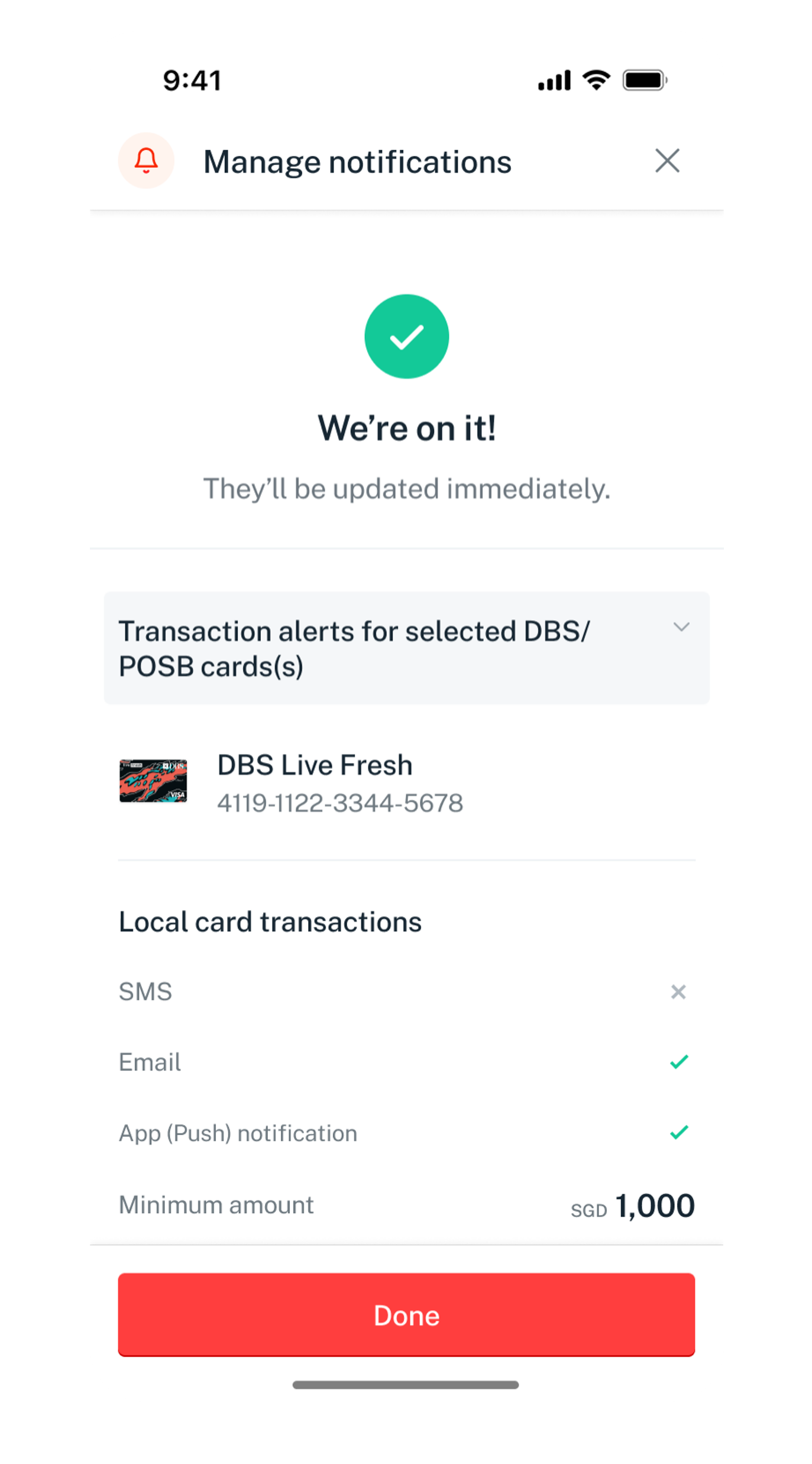 - The default threshold settings for notification alerts on all DBS/POSB cards is S$500, with notifications sent via email, push notifications, and SMS. This applies to all card transactions (including cash advance) made via AMEX, Mastercard, NETS, UnionPay or Visa.