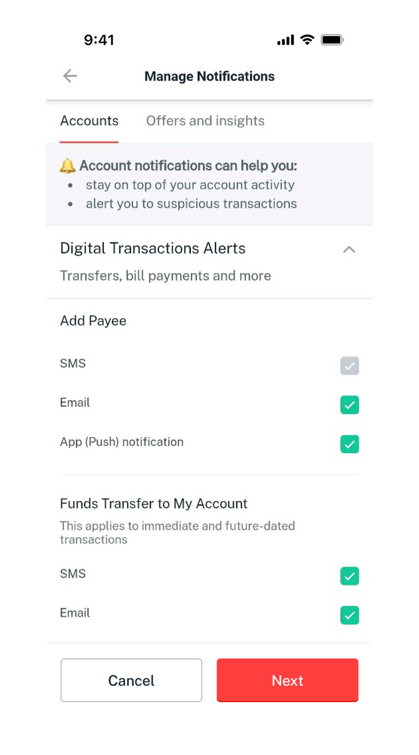 - For enhanced security, email and push notification alerts are mandatory for Digital transactions and Personal account updates.