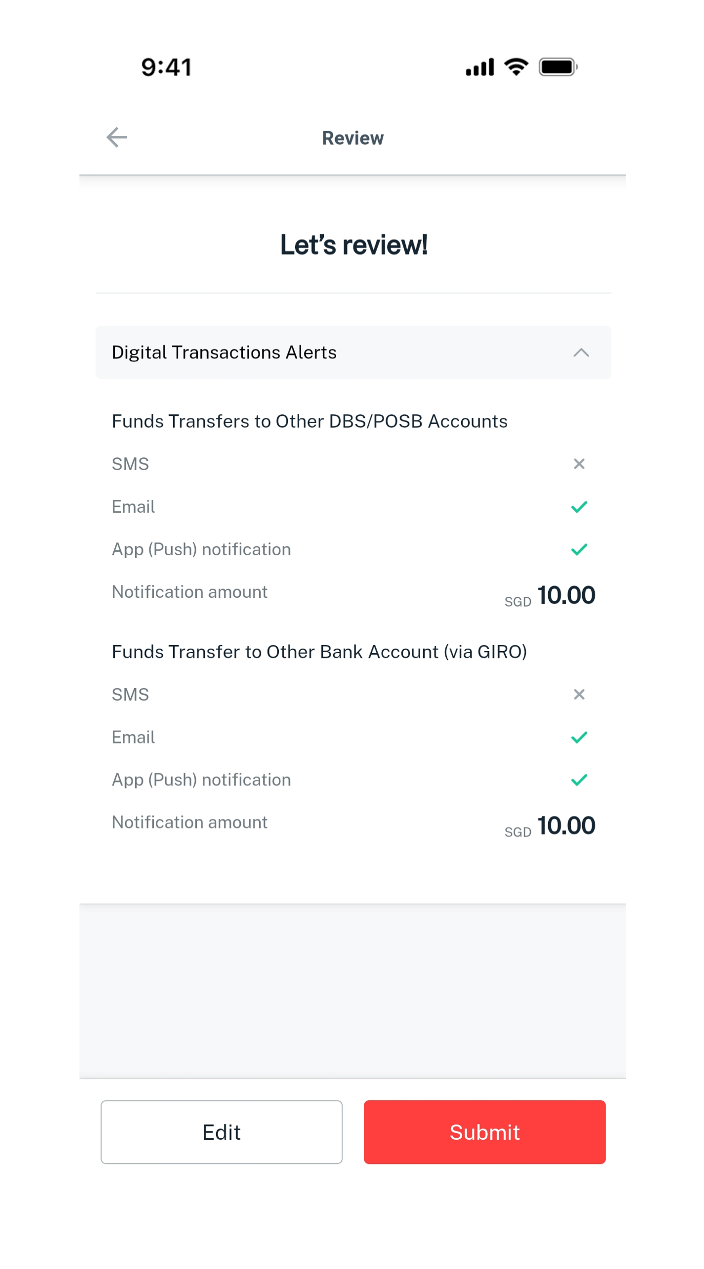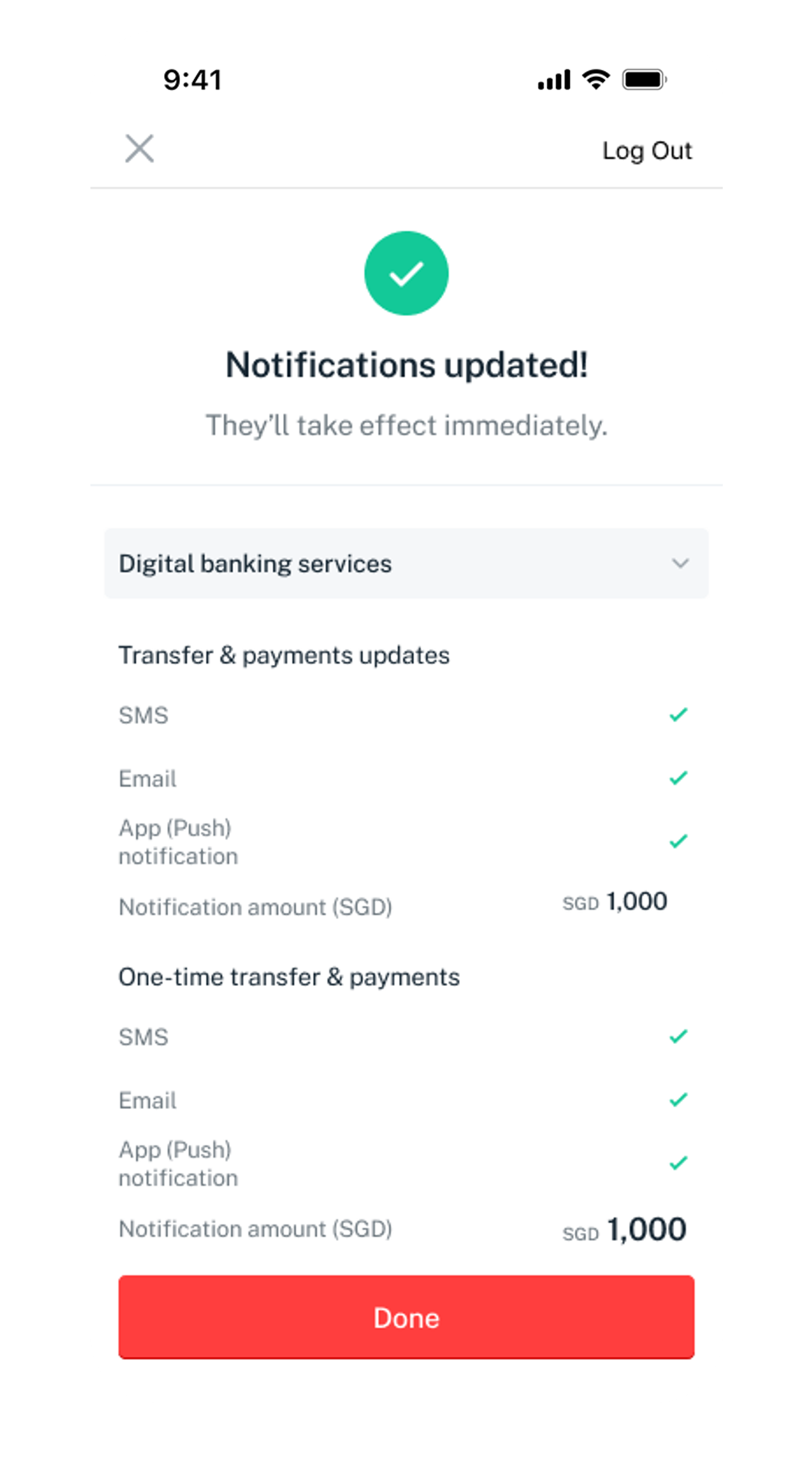 - To receive push notifications, ensure that you have turned on push notifications for your digibank mobile app. Learn more on how to enable push notifications for your digibank.