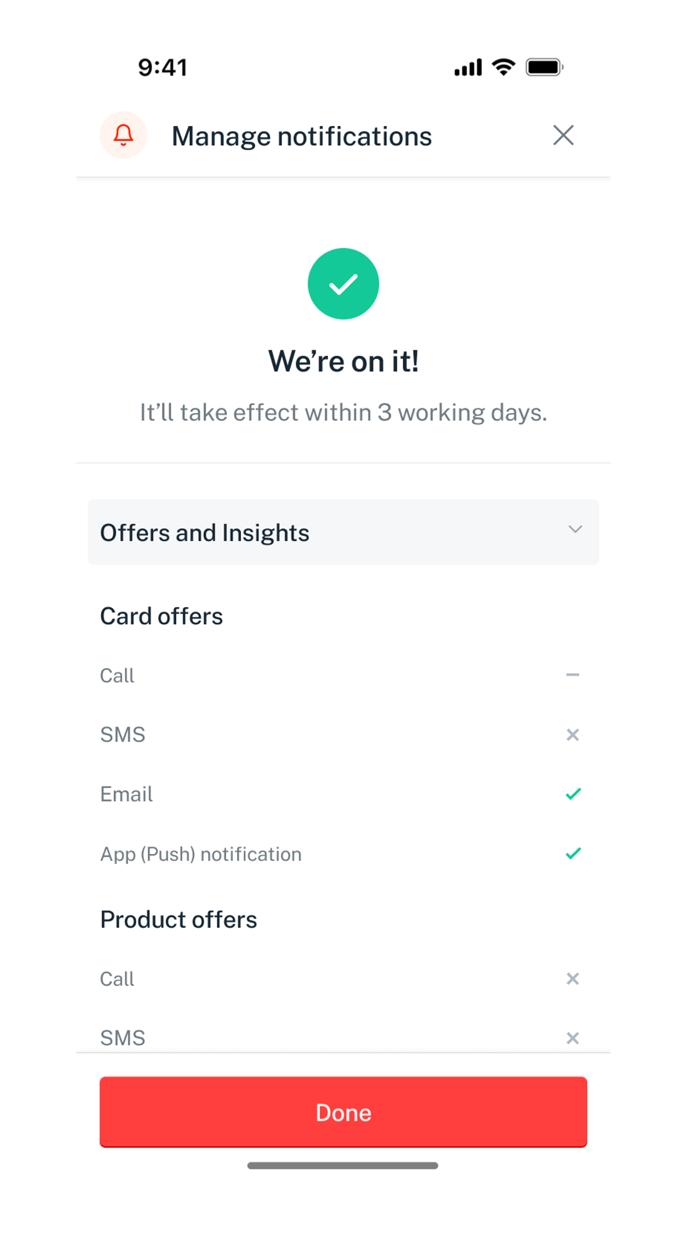 - For changes on Offers & Insights Notifications settings, it will take up to 3 business days to take effect.