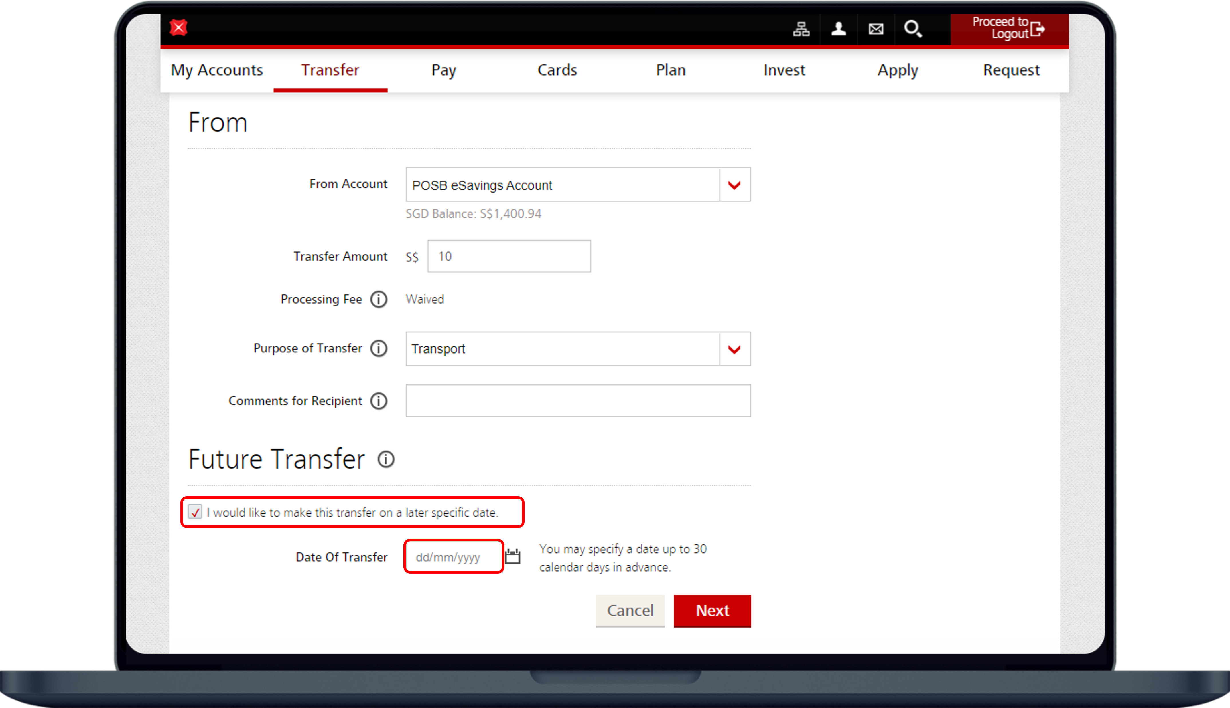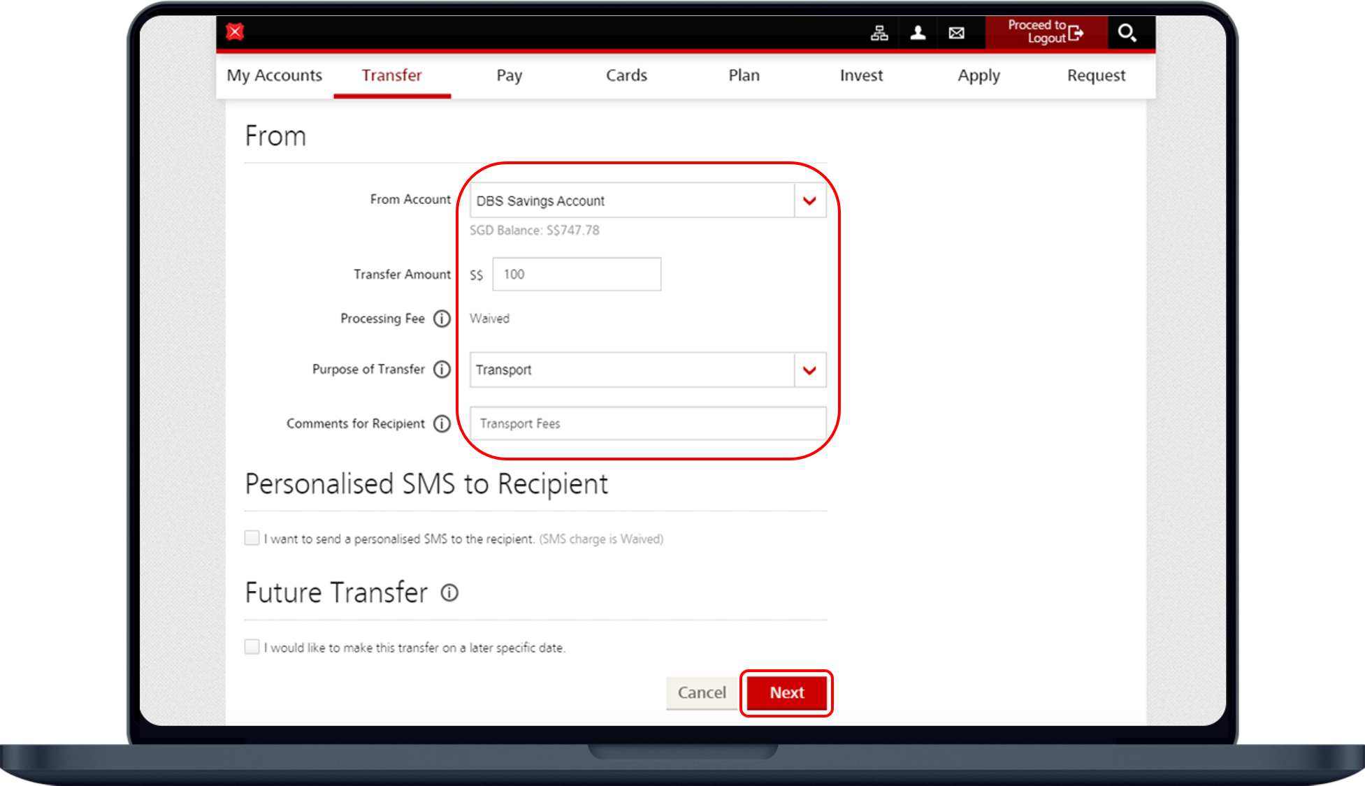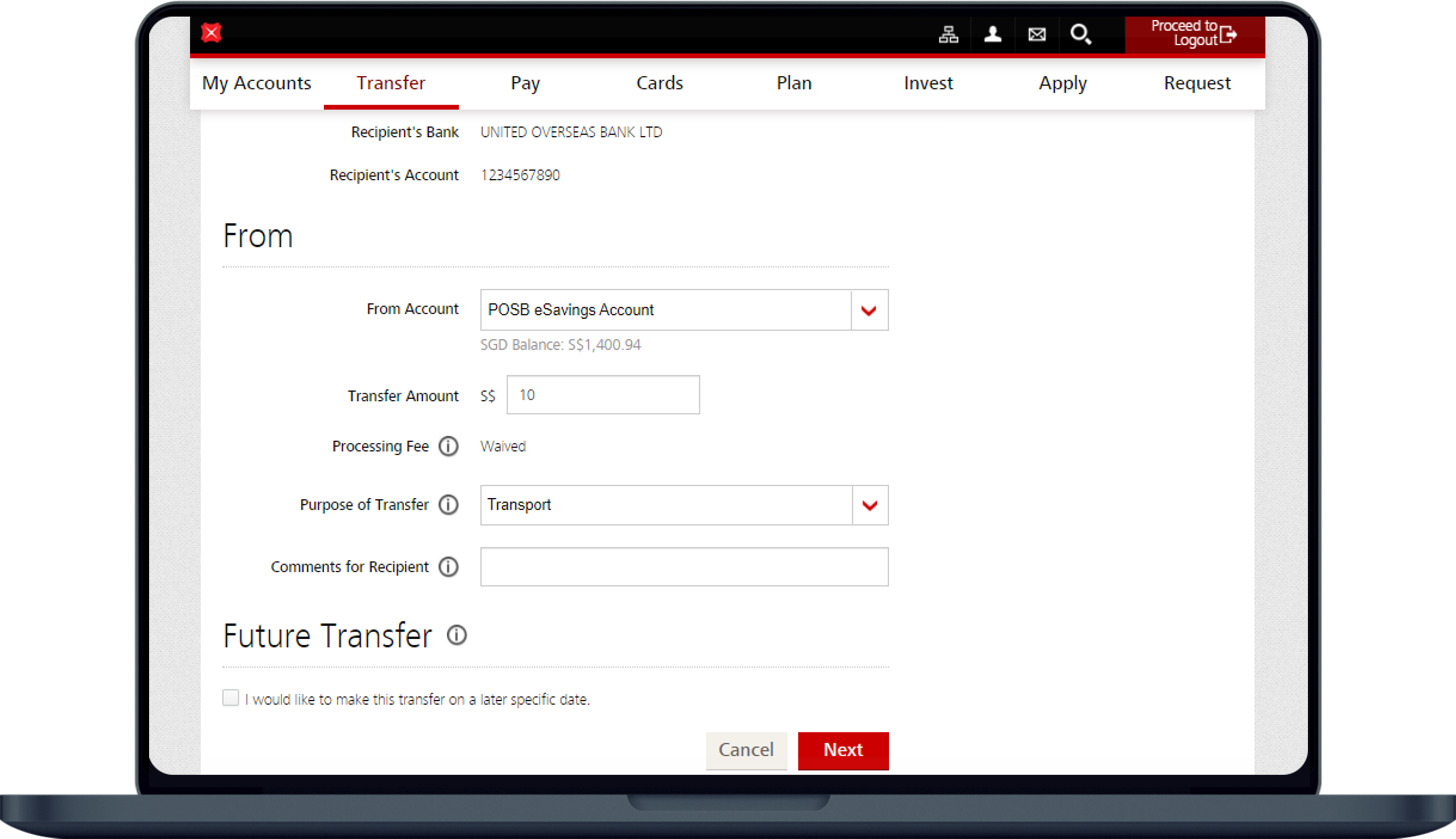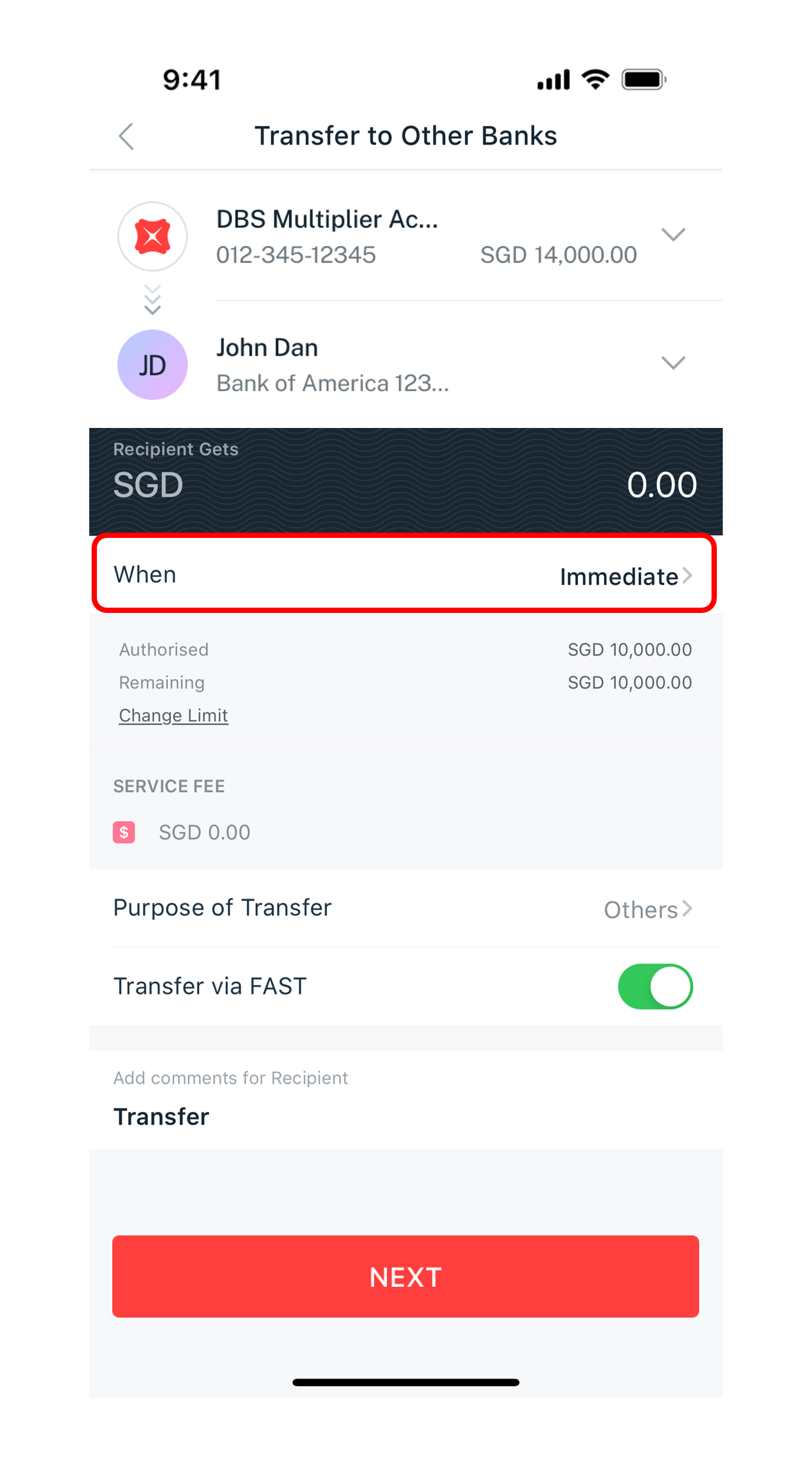 Learn how to send SGD or foreign currency to another DBS/POSB account or a different bank in Singapore. You can also schedule transfers to be sent out on a later date using digibank.