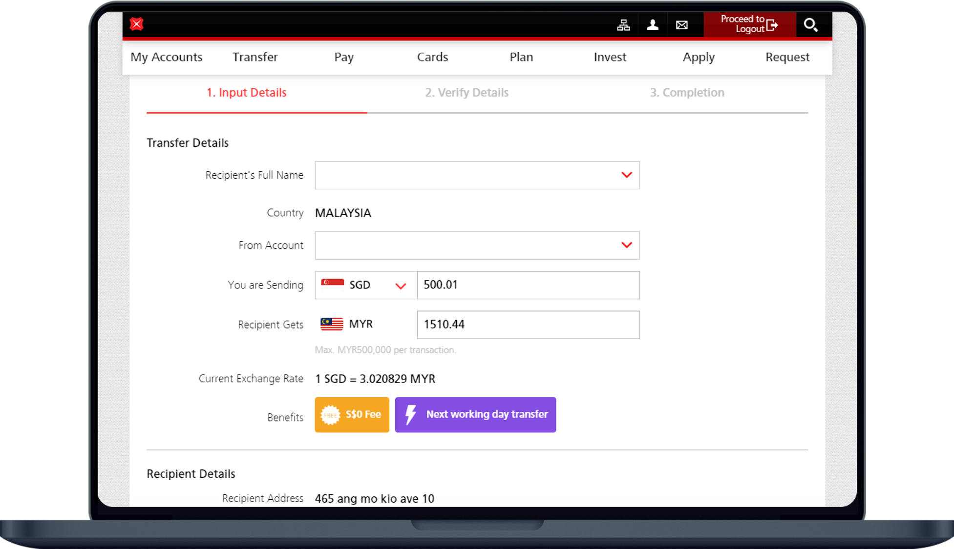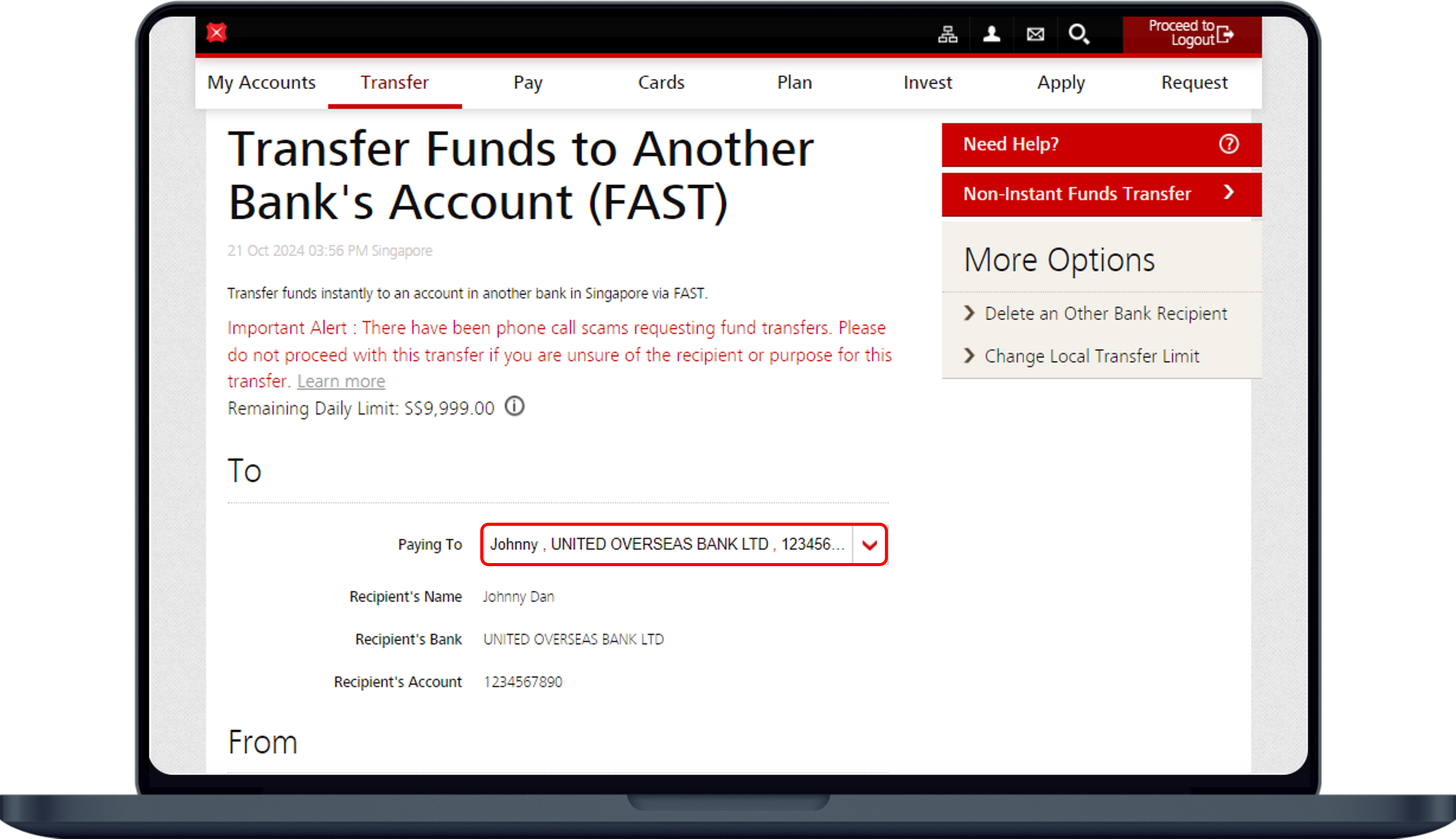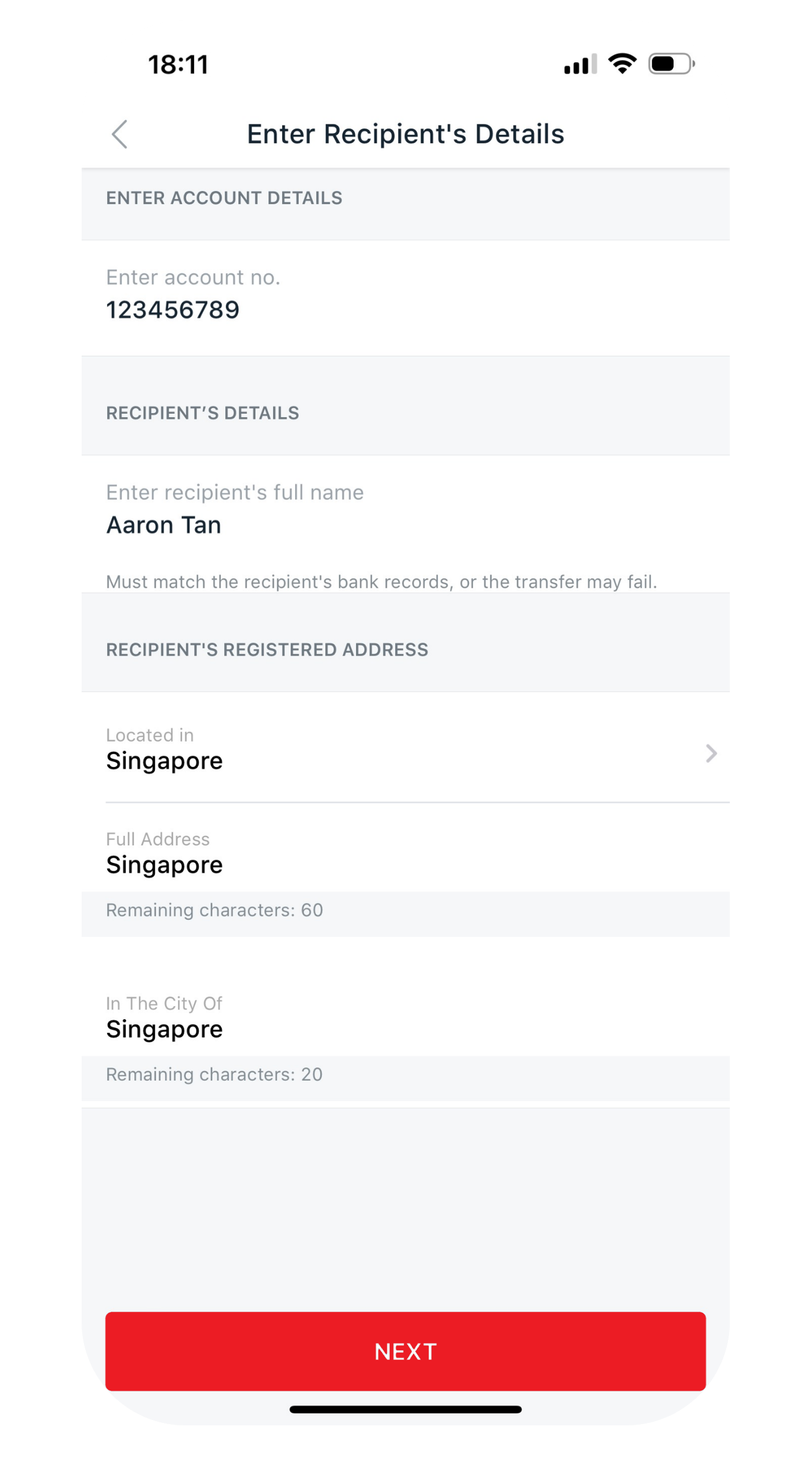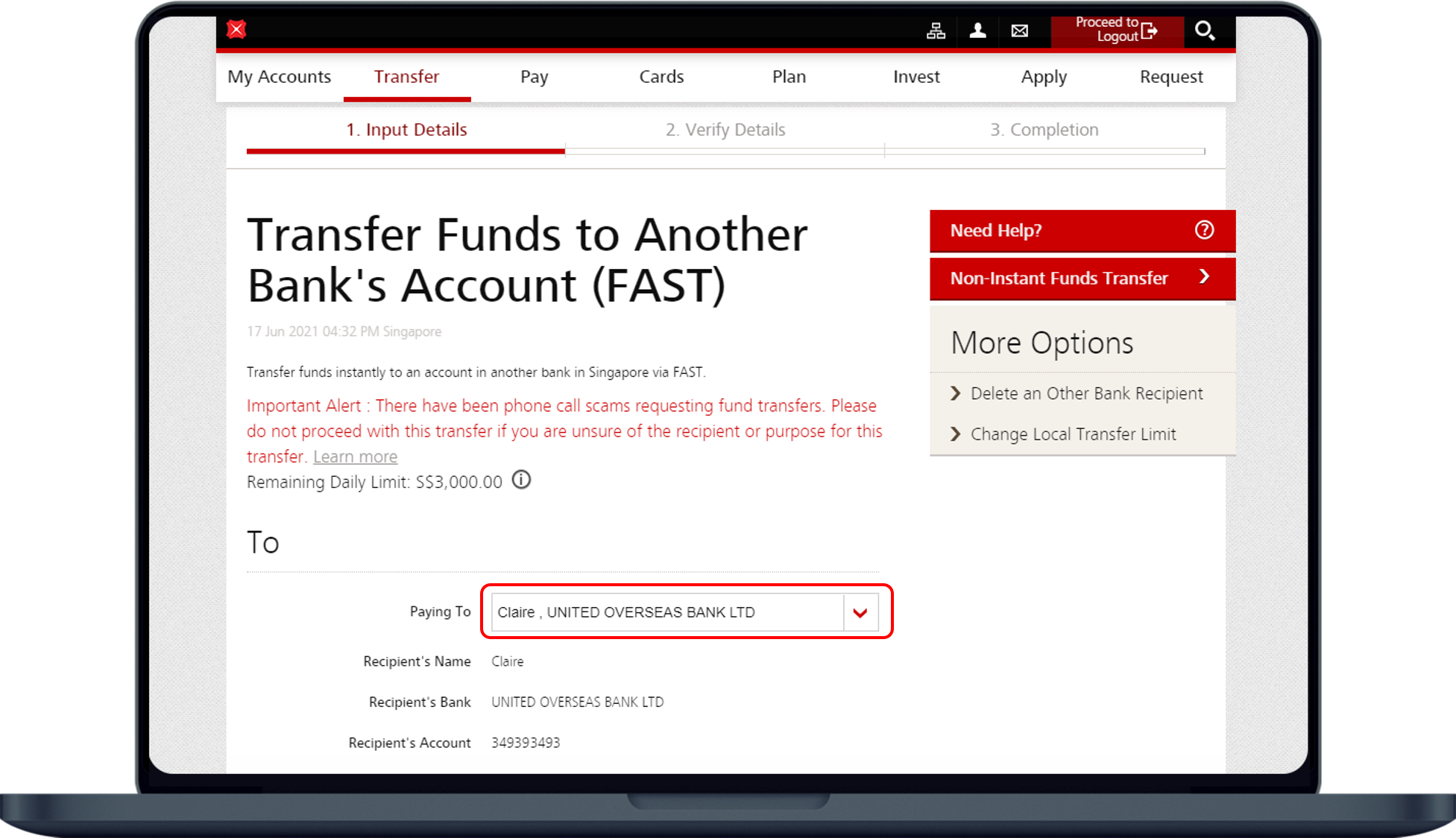 - The recipient's name you enter only serves as reference for you. The transfer is processed based on the account number you provided.