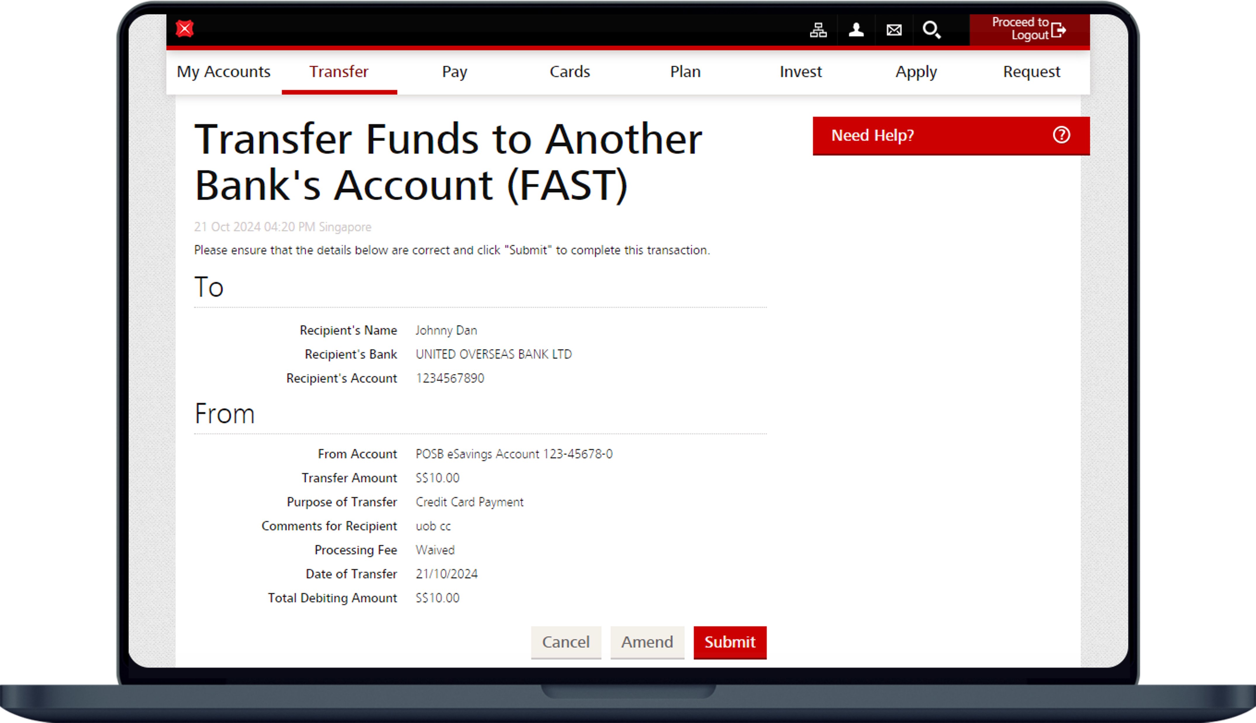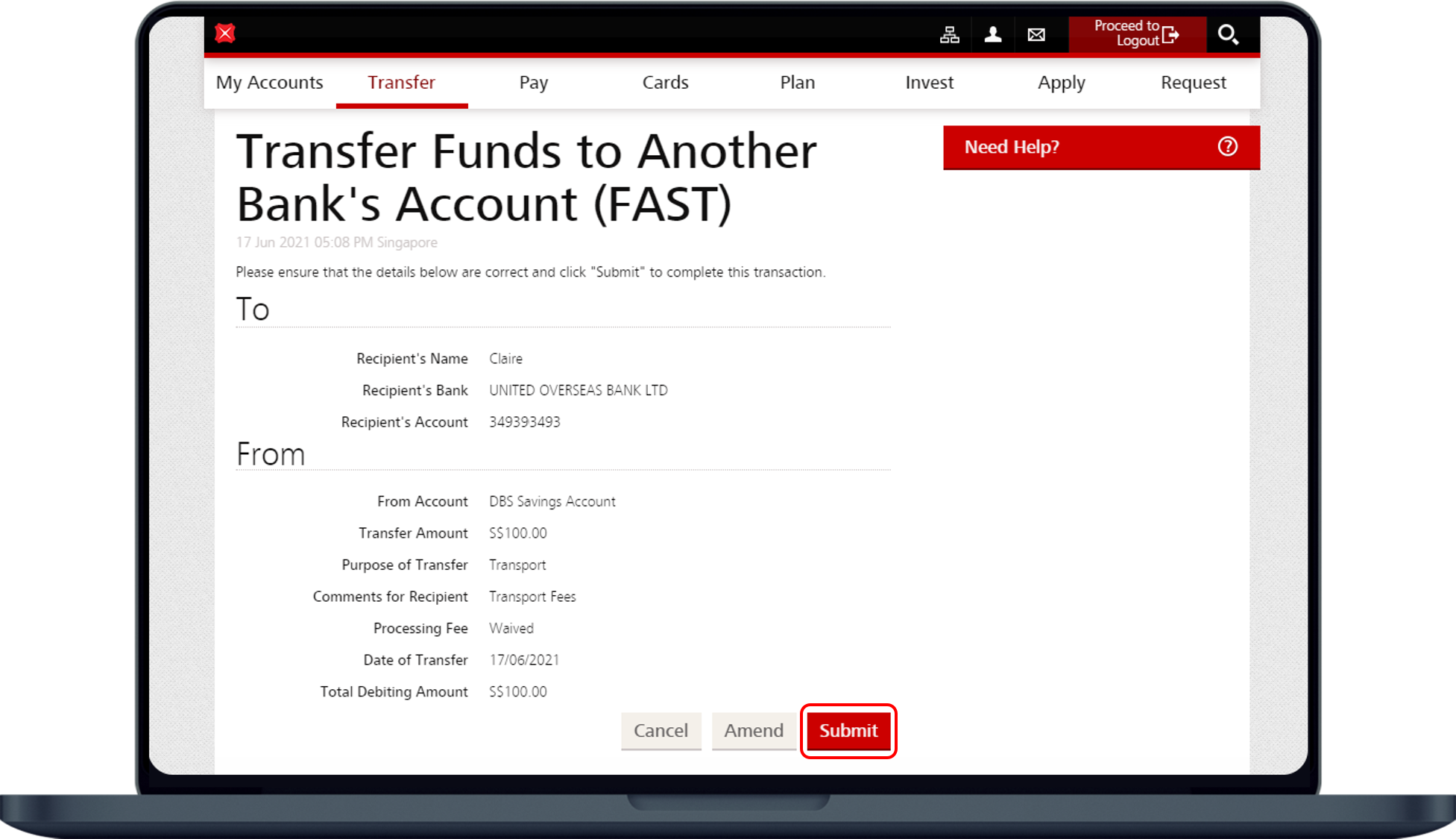 - Review the trasnfer details and click Transfer now to submit your fund transfer request.