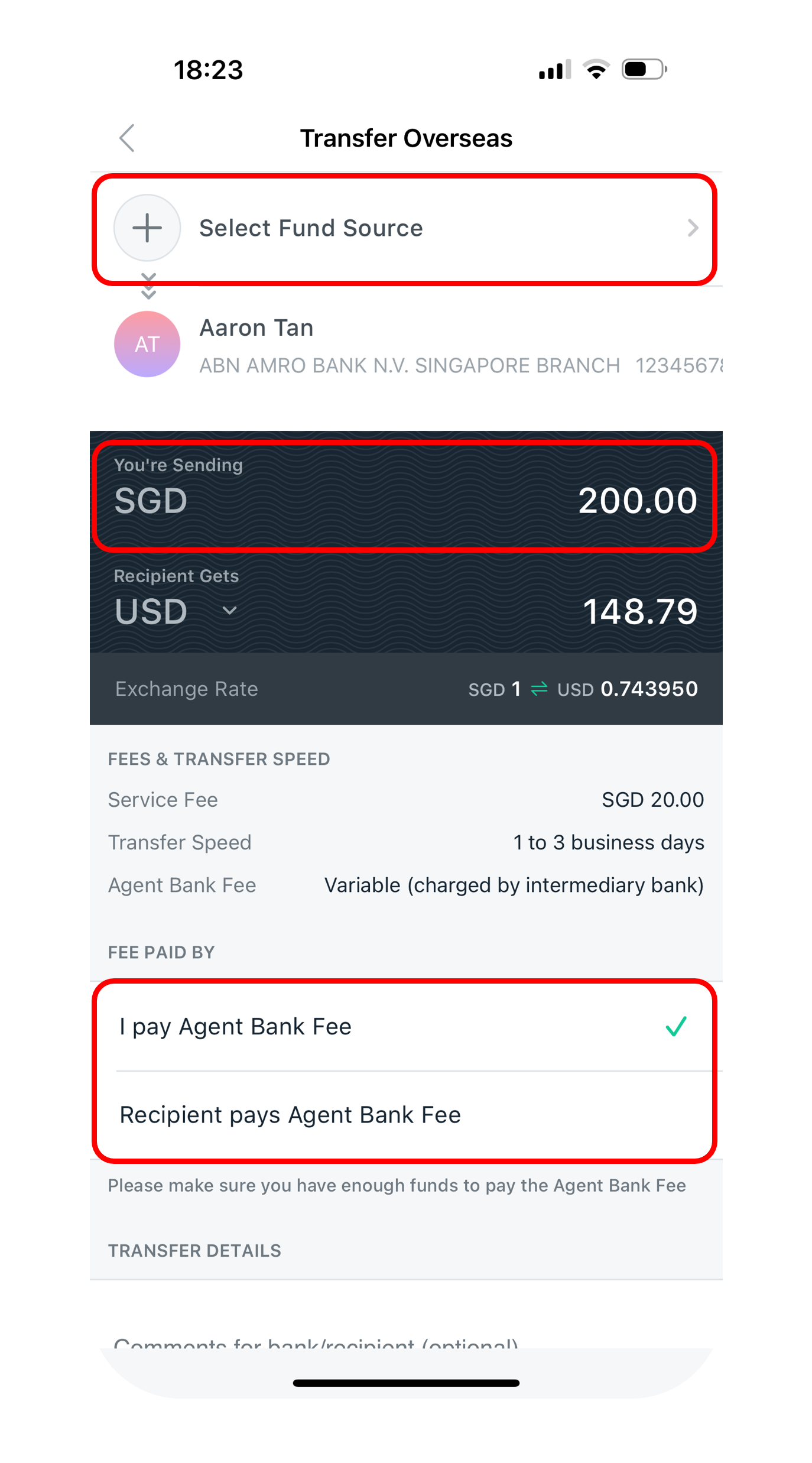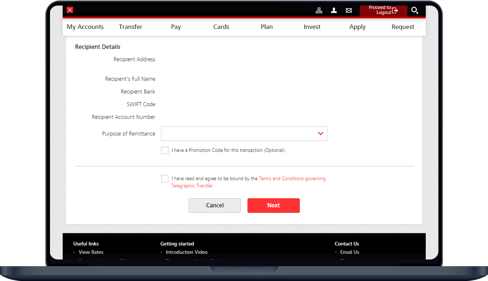 (If the recipient is not in your recipients list, follow the steps to add overseas funds transfer recipient) - Select your debiting account you wish to transfer from and enter the Amount you wish to transfer. Select either You pay the fees or Recipient pays the fees. Click Next.