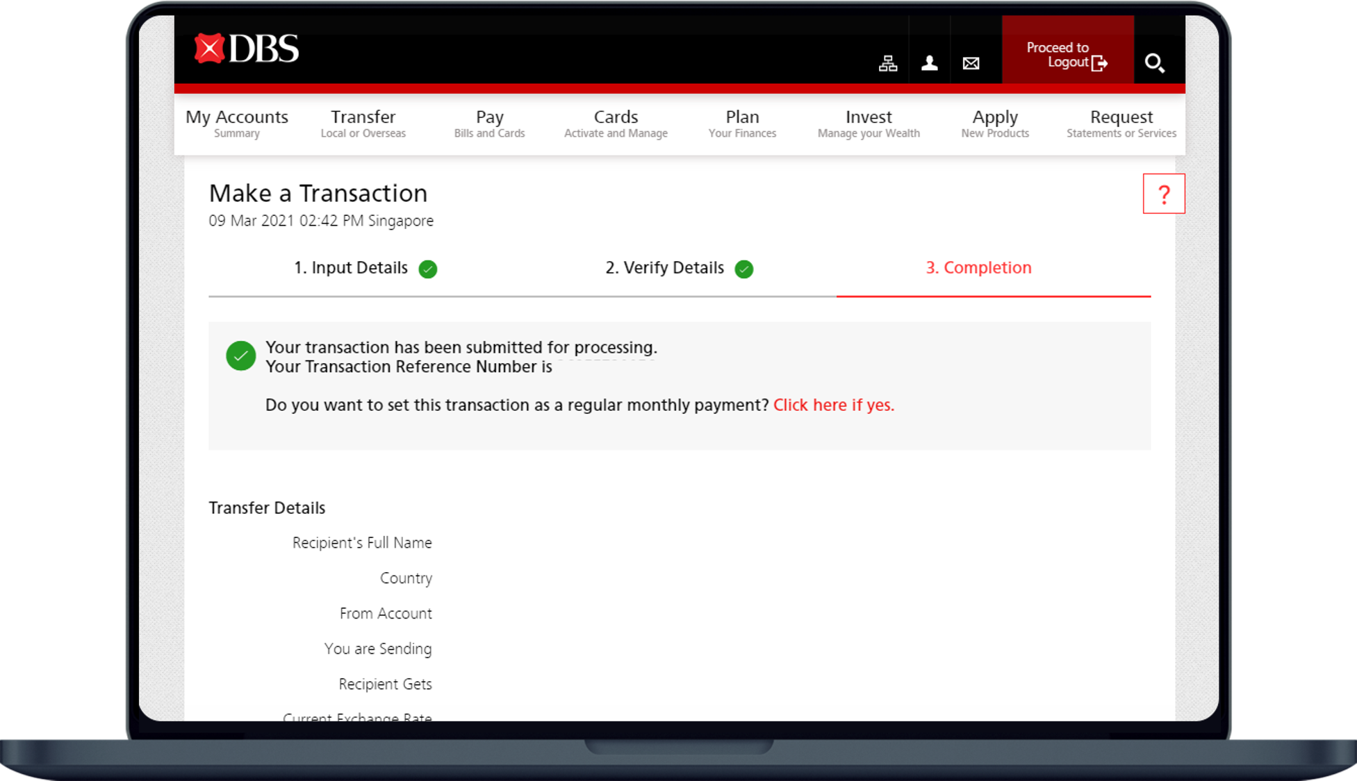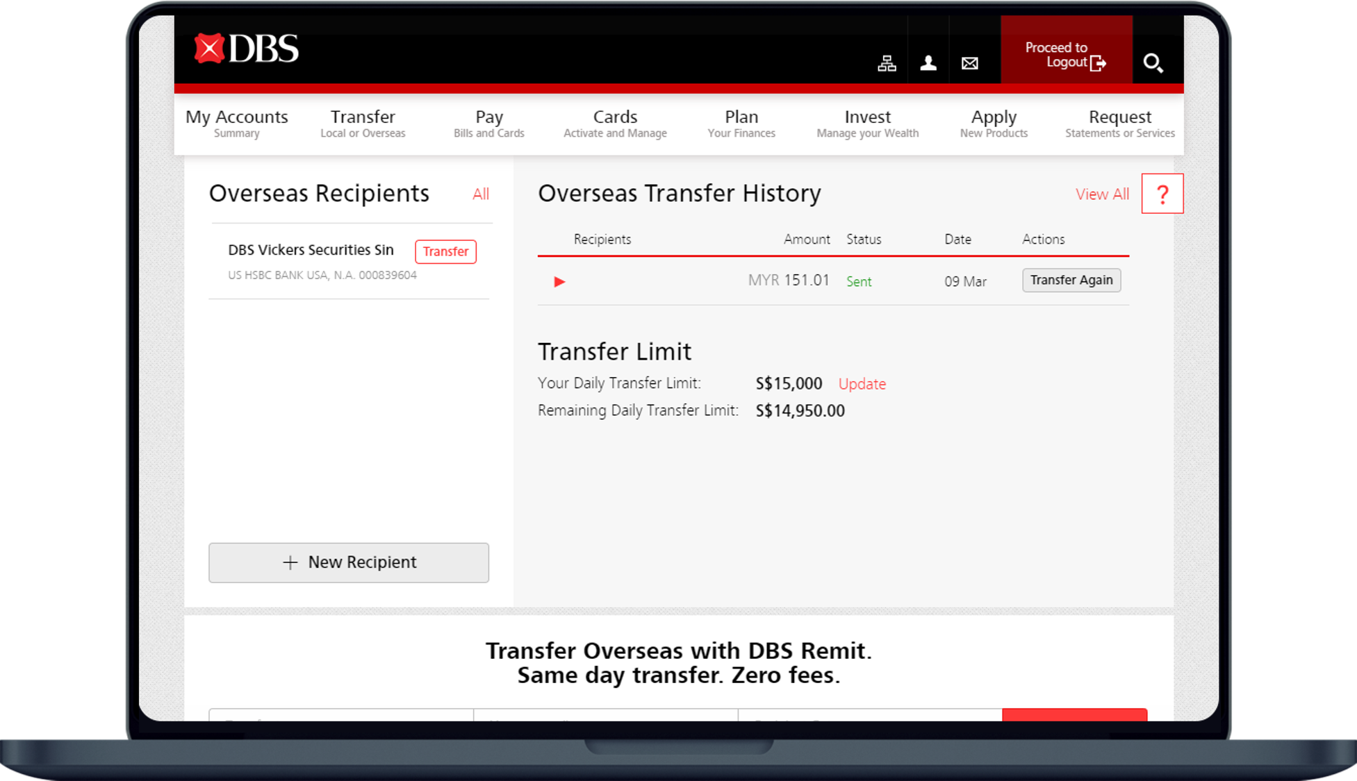 - Ensure accurate information and sufficient funds in your debiting account for the processing of the transfer. In the event of missing information and/or insufficient funds, DBS Bank reserves the right to reject the application.