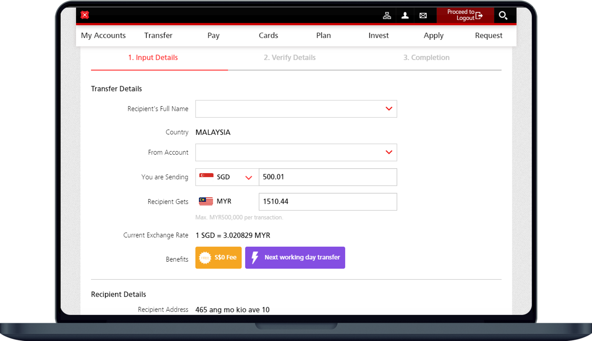 - For transfers to individuals with long names or corporations: If there is insufficient space, you may use the Full Address field under Recipient Details to continue filling in the recipient’s full name.