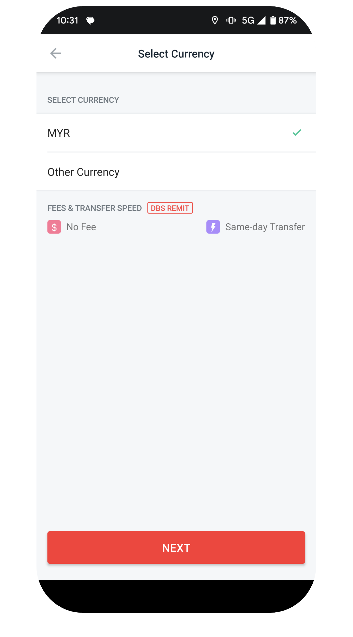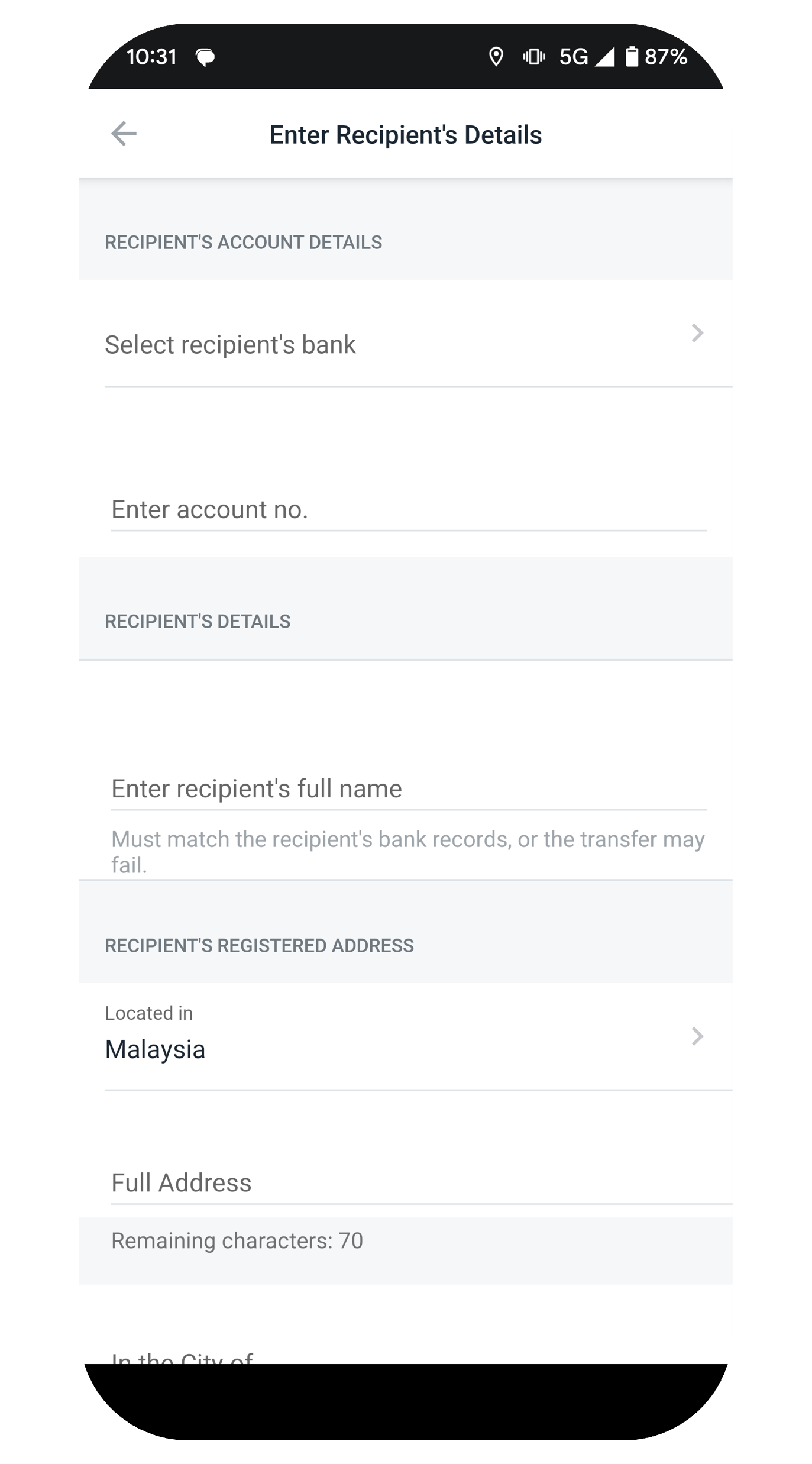 Select the Currency and enter your recipient's Bank Account Details, followed by their Personal Details. Tap Next.
