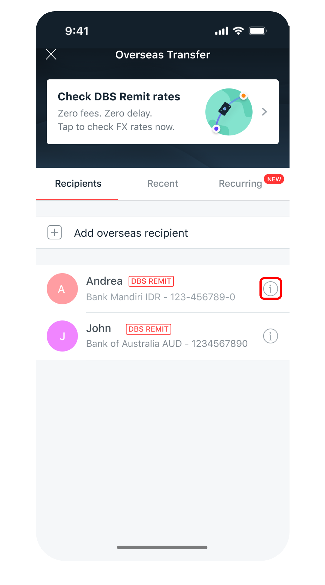 There are various channels which you may remove overseas funds transfer recipient with us. The most convenient method would be via digibank mobile.