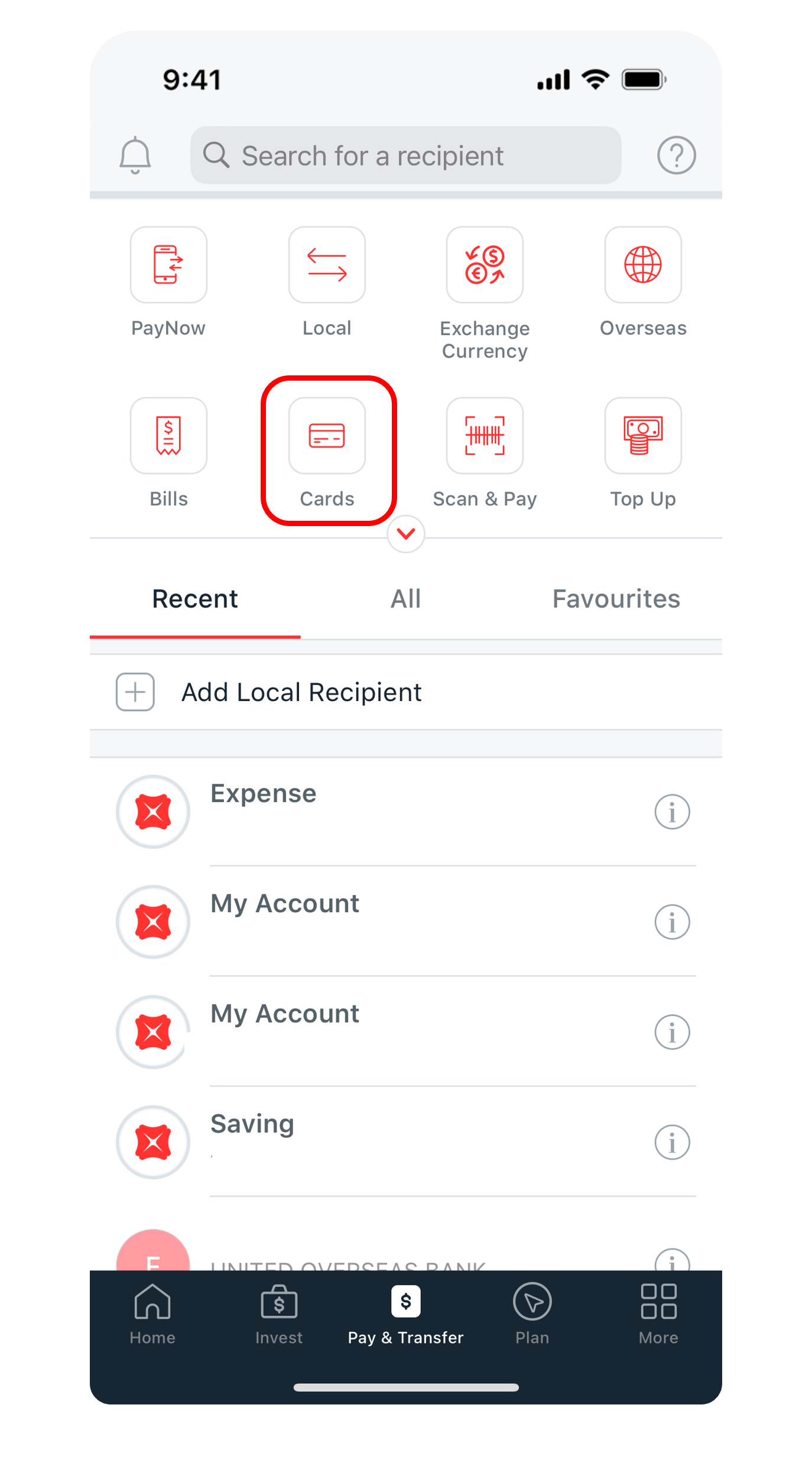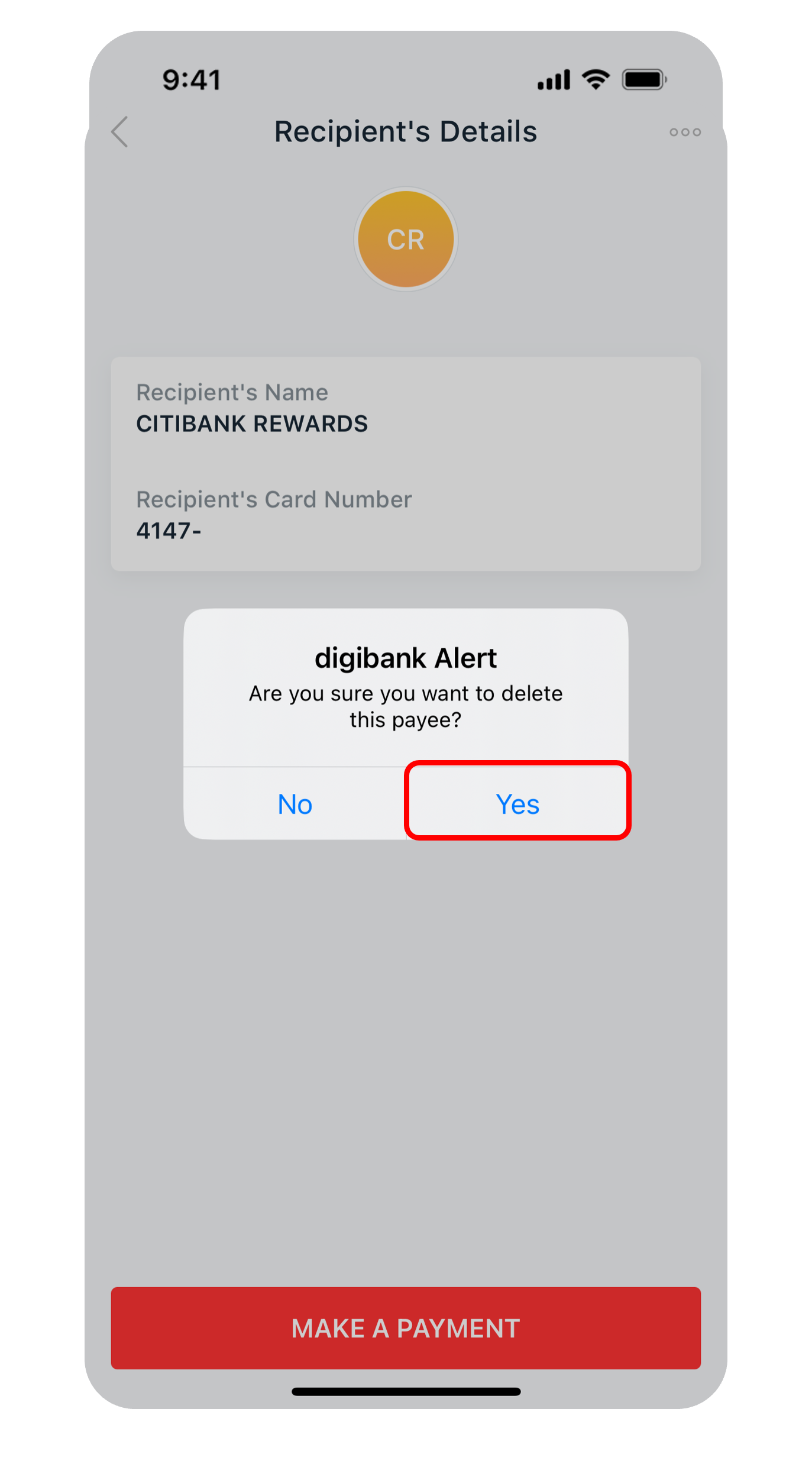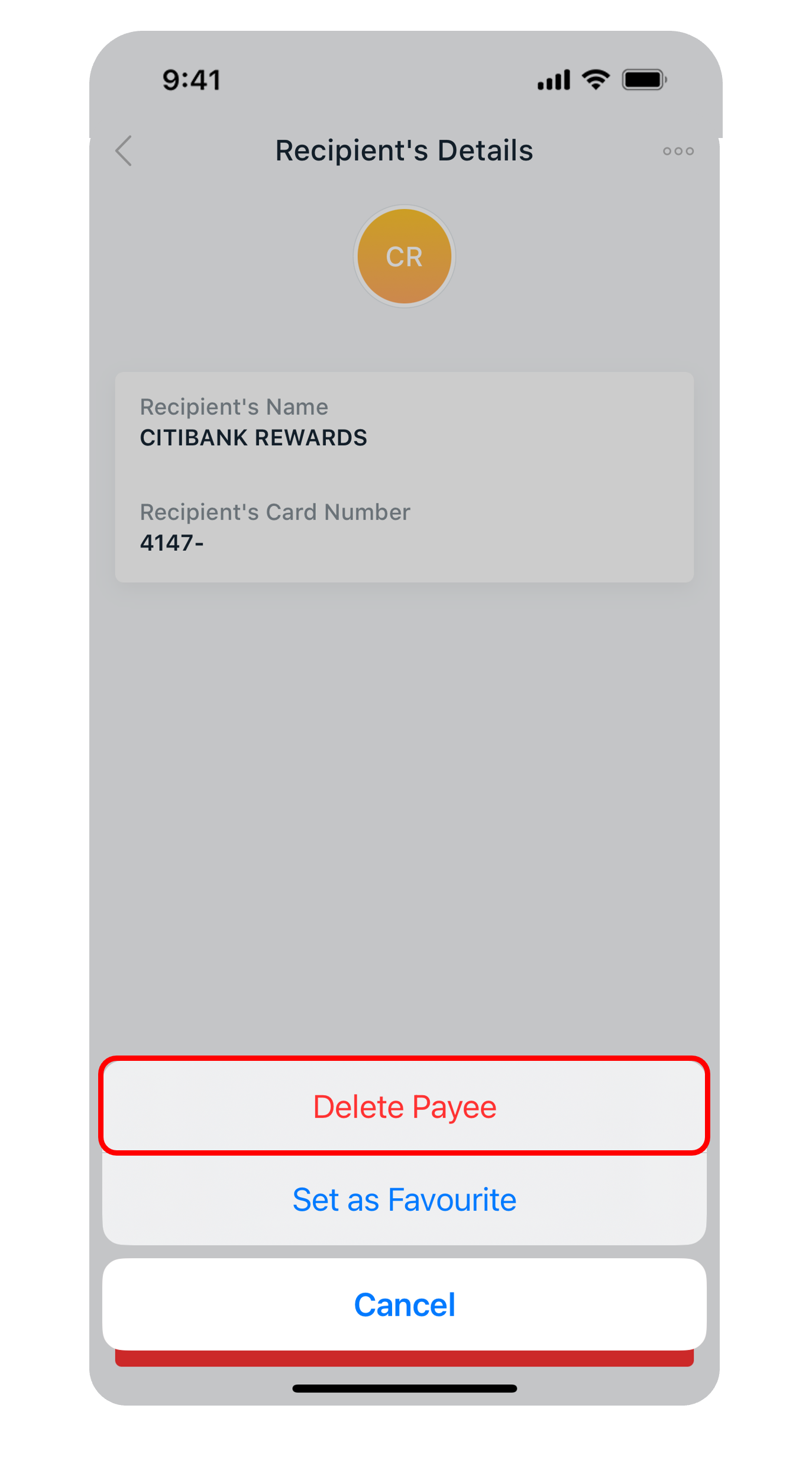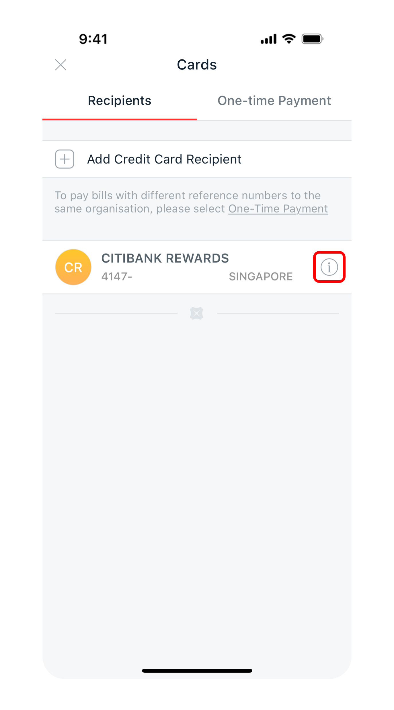 There are various channels which you may remove other bank's credit cards recipient with us. The most convenient method would be via digibank mobile.