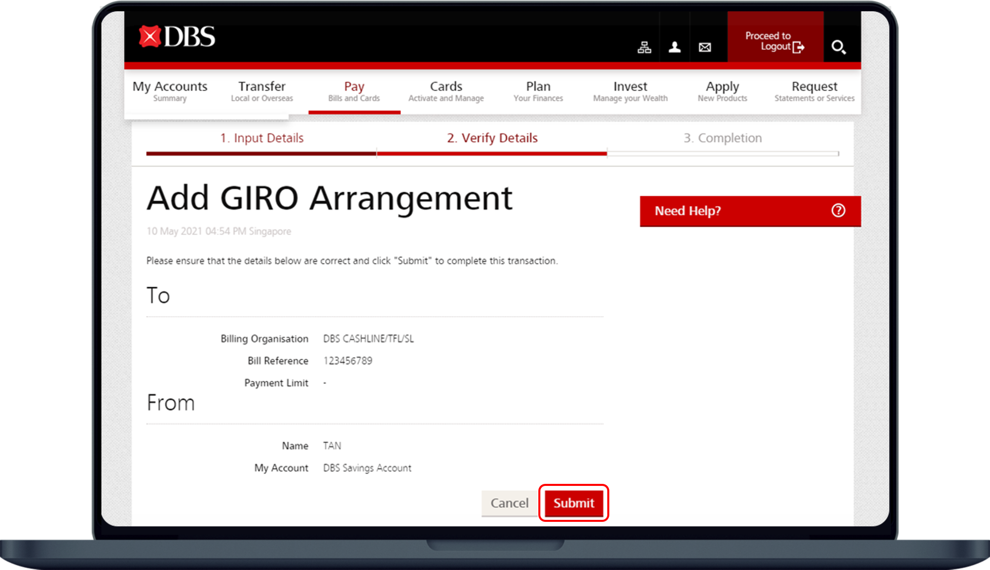 • Verify your GIRO arrangement details and click Submit to complete the set up.