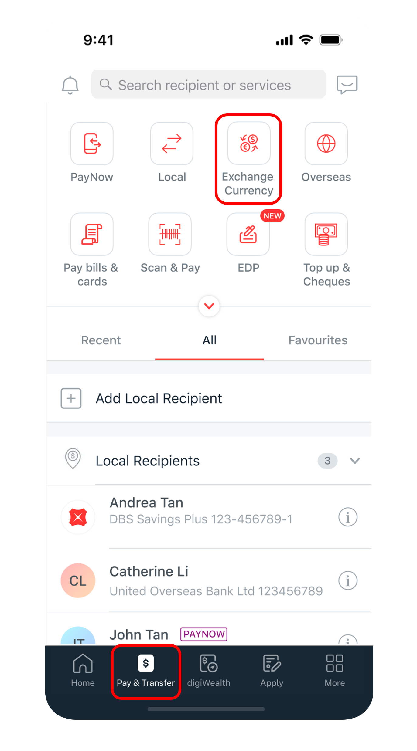 Tap Pay & Transfer at the bottom and select Exchange Currency.