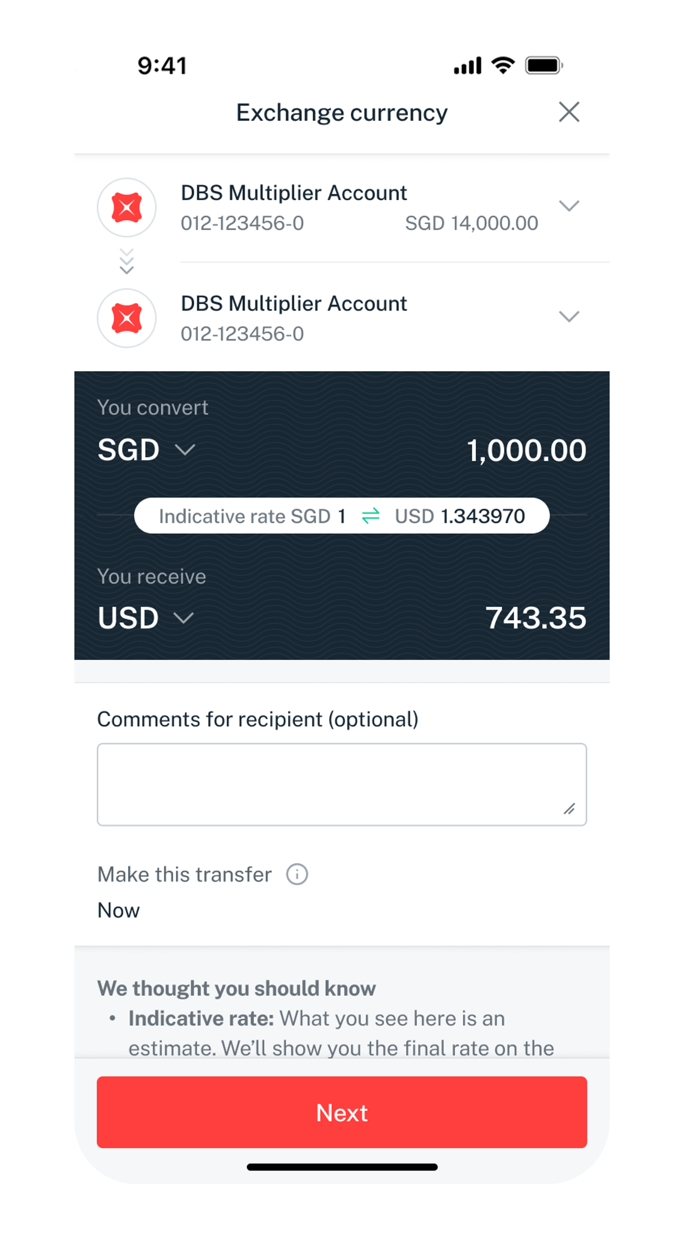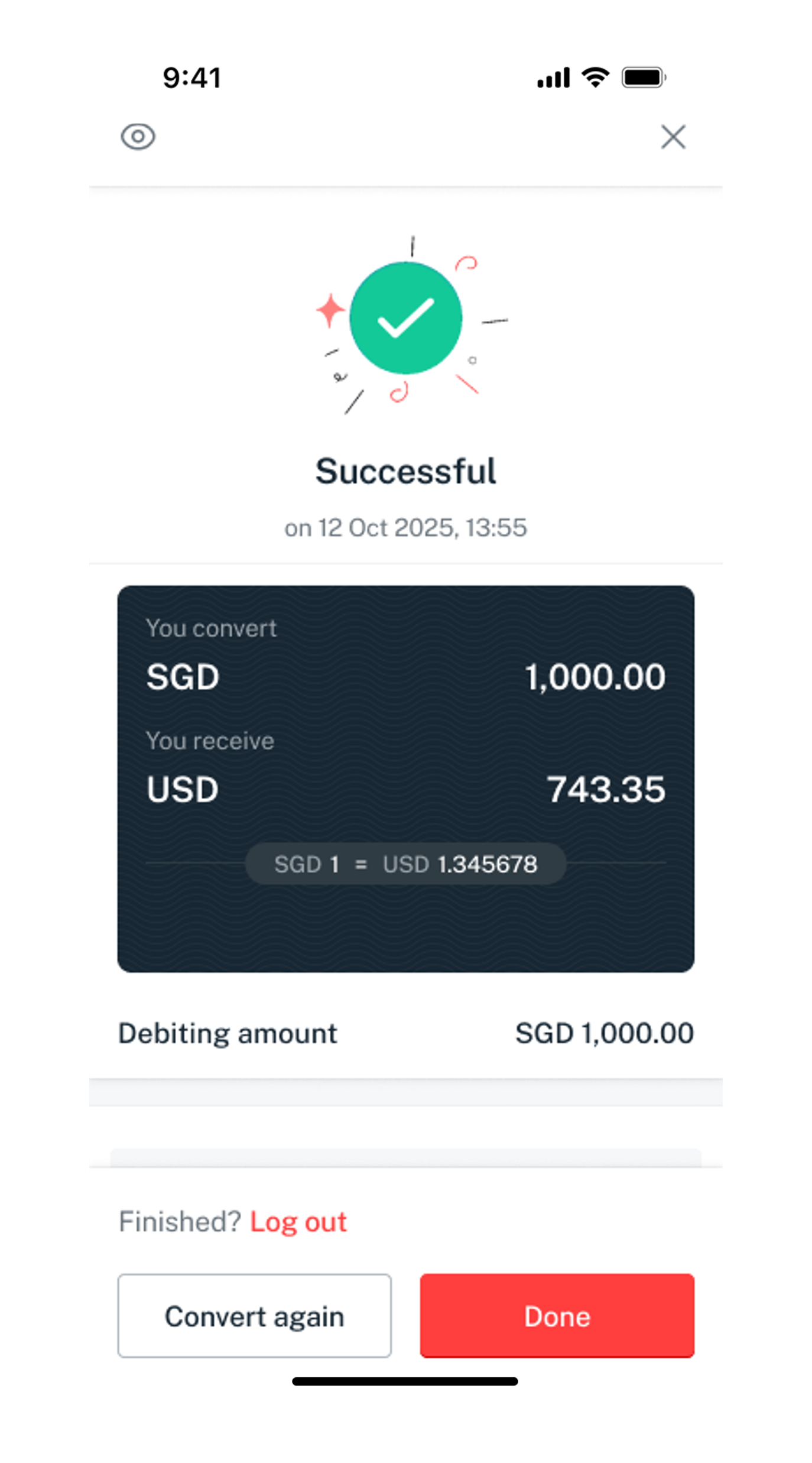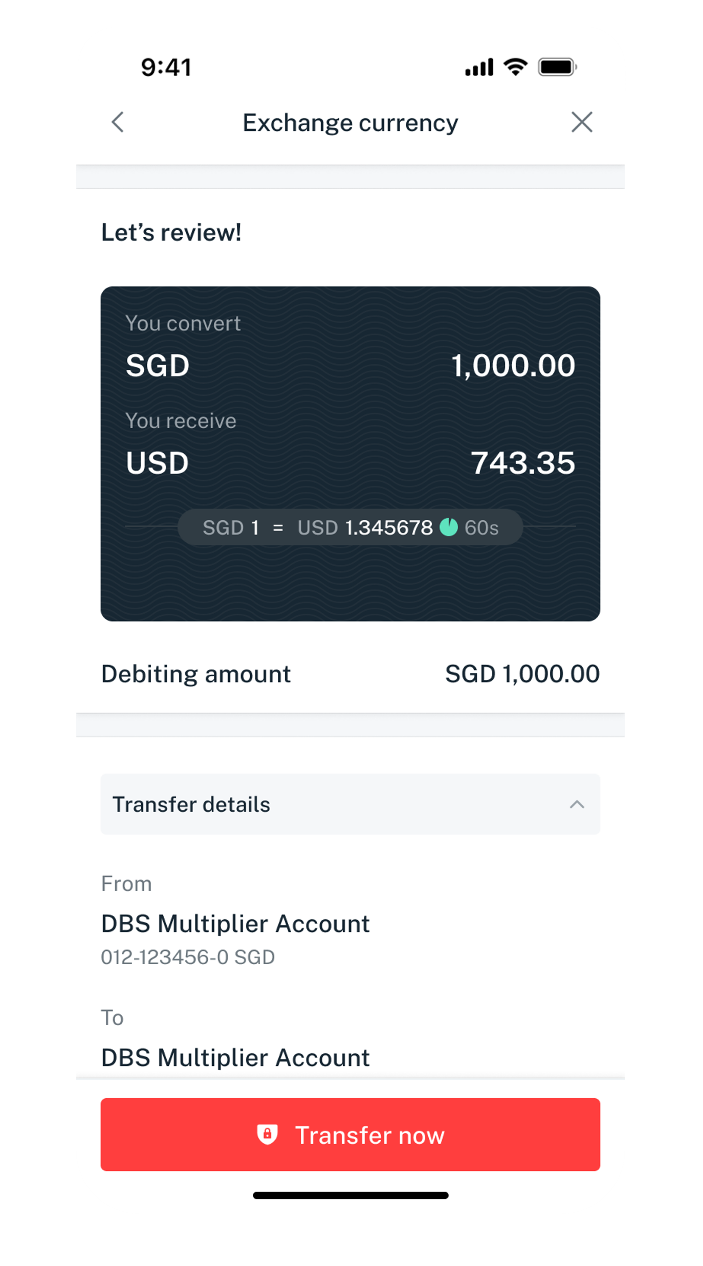 Verify your currency exchange details and tap Transfer now.