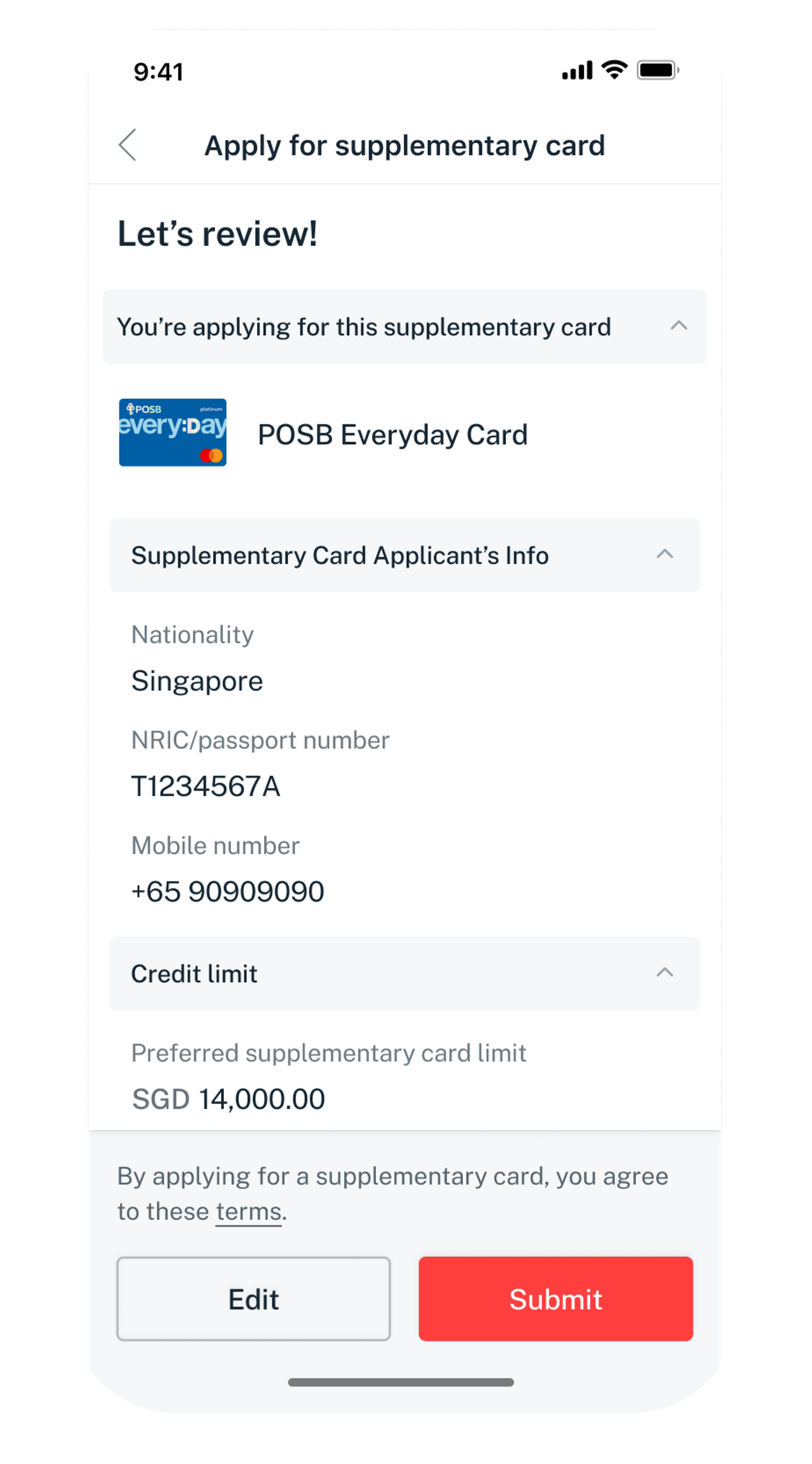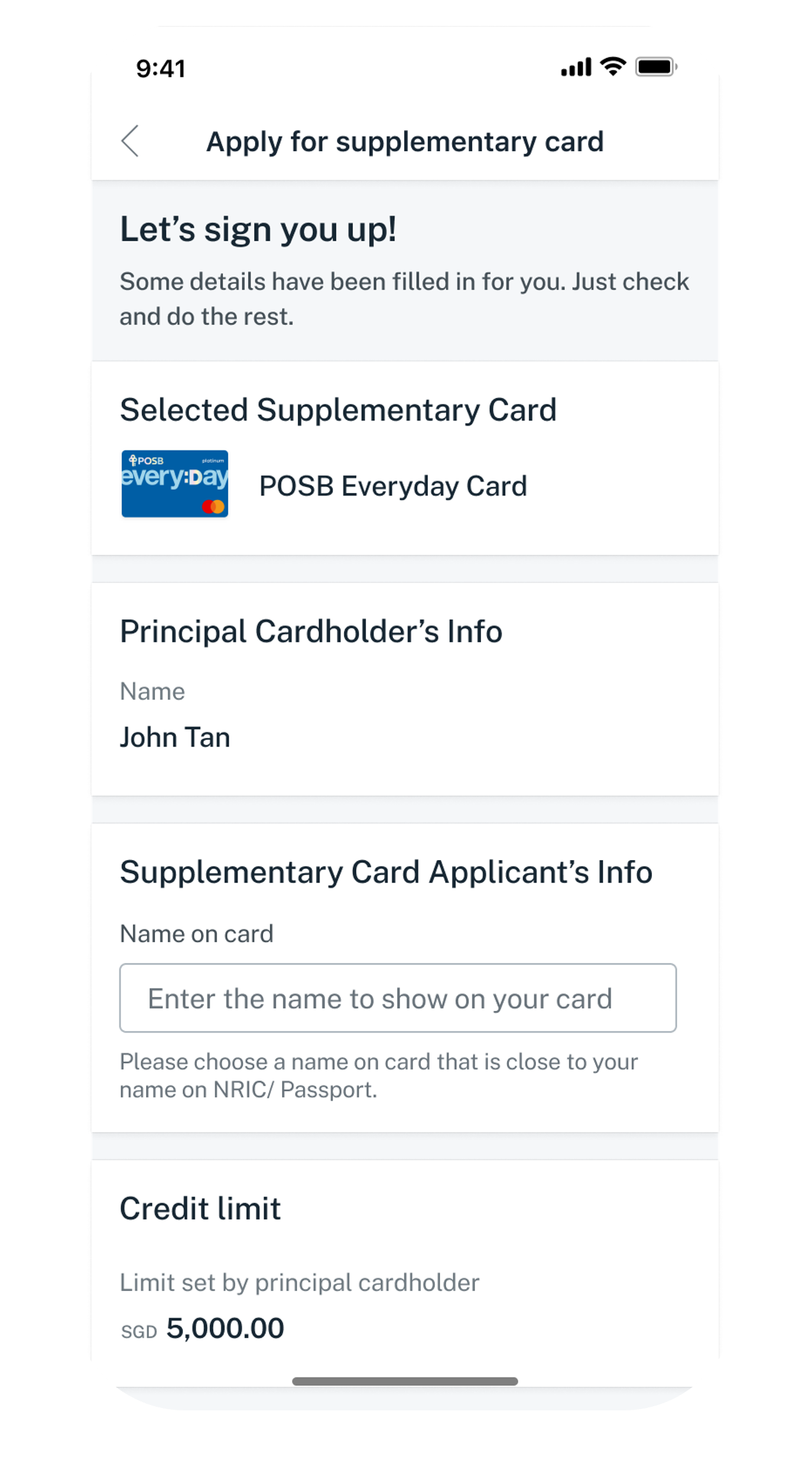 If you’re an existing DBS/POSB credit cardholder, you can easily apply for a Supplementary Card and get instant approval via digibank mobile.