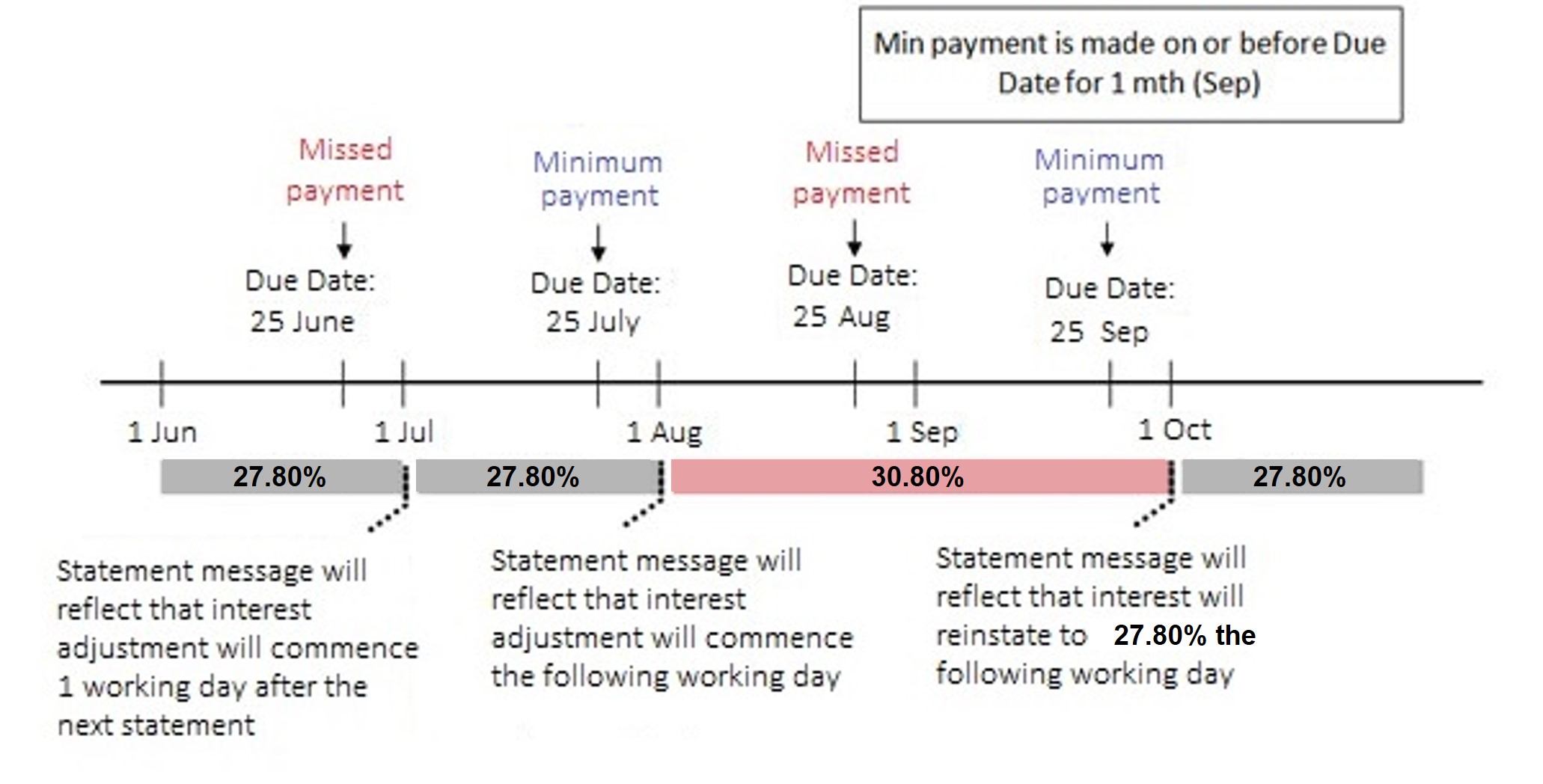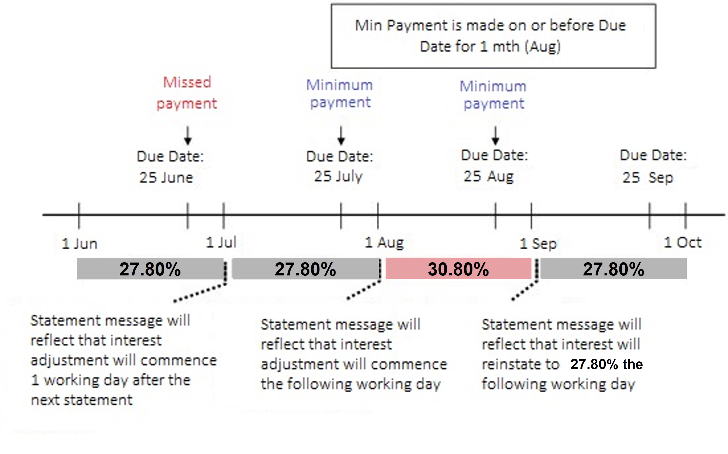 If you have not made the minimum payment by the payment due date, an increased interest rate of 30.80% per annum will be applied to your outstanding balance in your credit card account from the first working day of the following month after your next Credit Card Statement is generated.
