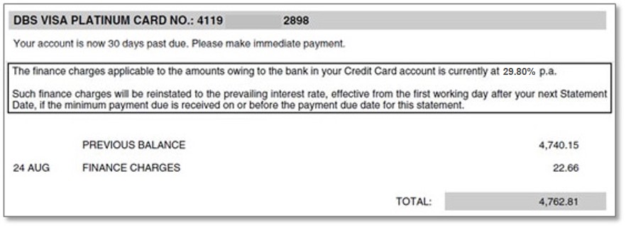 If you have not made the full payment by the payment due date, you will be billed for finance/interest charge on your next Credit Card Statement computed at the prevailing rate of 27.80% per annum, alculated daily from the date of transaction until receipt of full payment, subject to a minimum fee of S$2.50.