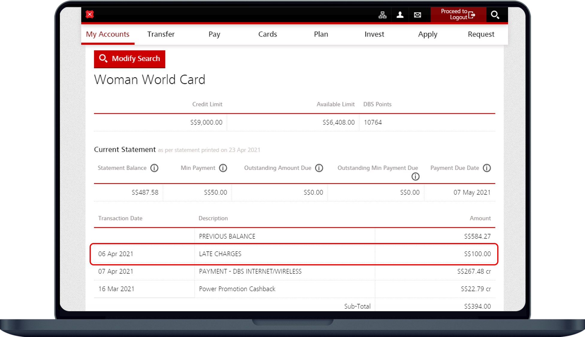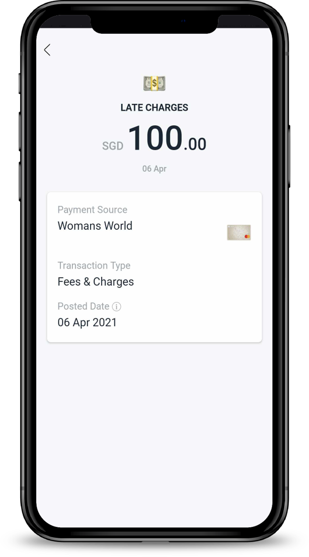 S$100 will be levied if minimum payment is not received on the card account by payment due date, provided your outstanding balance is above S$200.