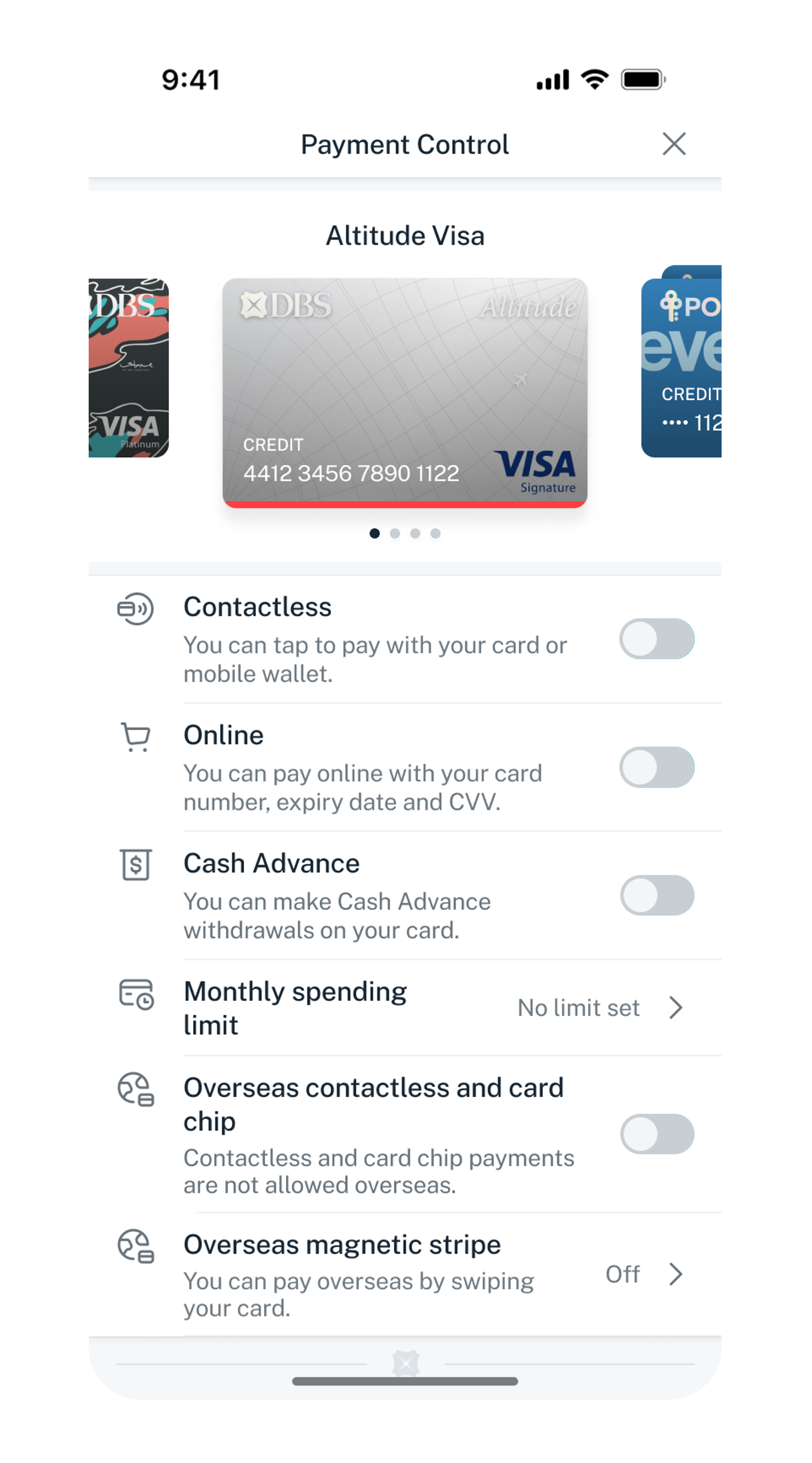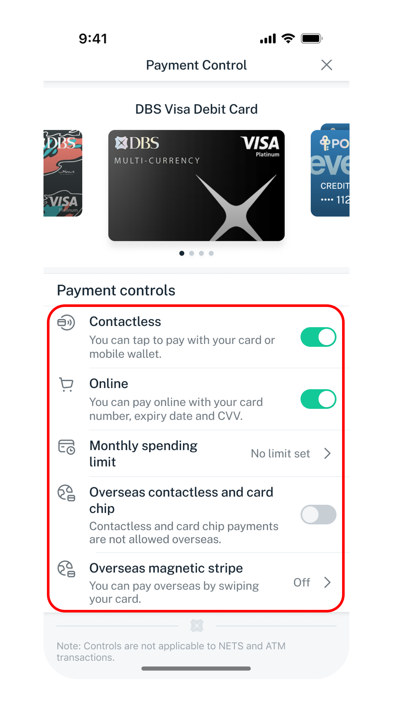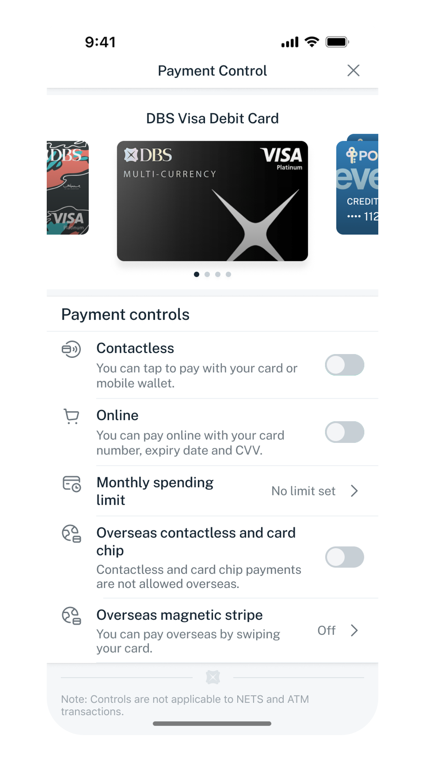 Examples include: SP Utilities recurring payments, AIA recurring insurance via In-app, Apple subscription. - Any new card replacement will not reset your customised card functions. If required, you may amend the setting once card is activated.