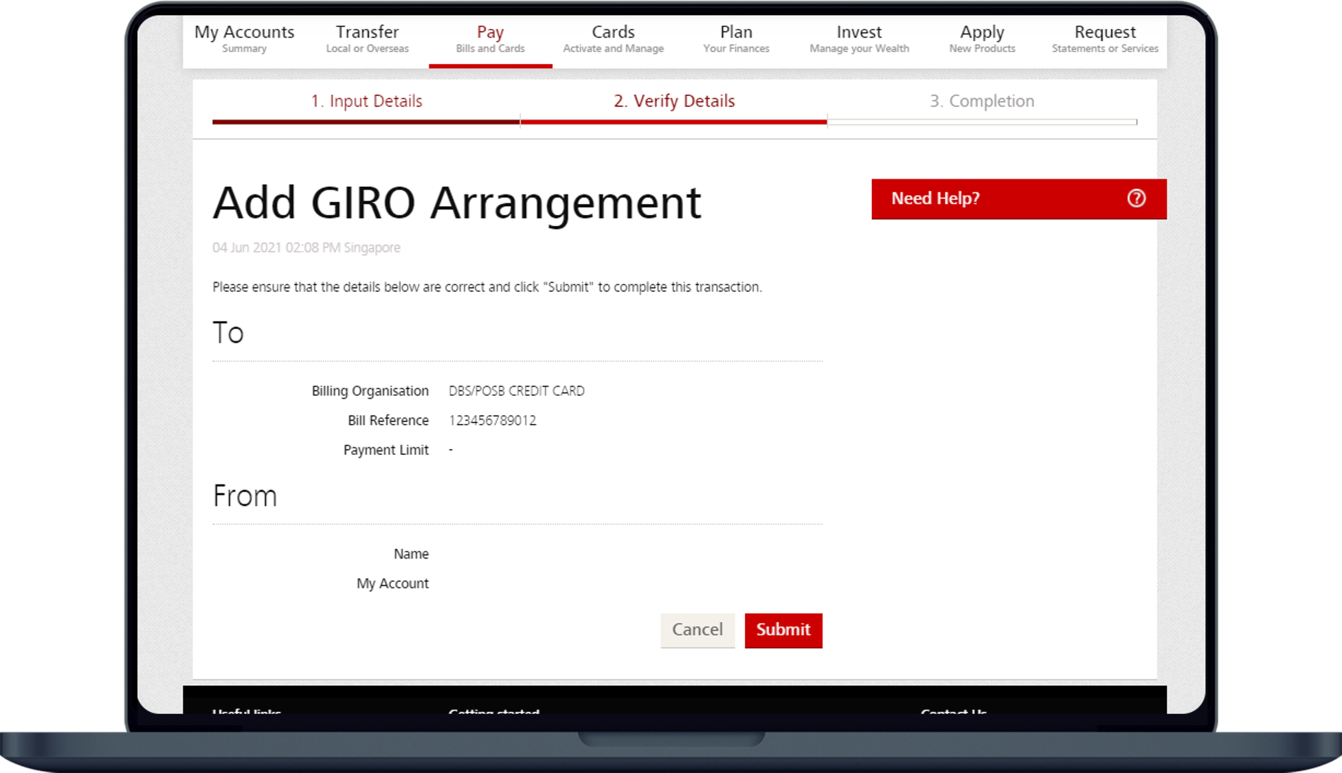 - Verify your GIRO arrangement details and click Submit to complete the set up.