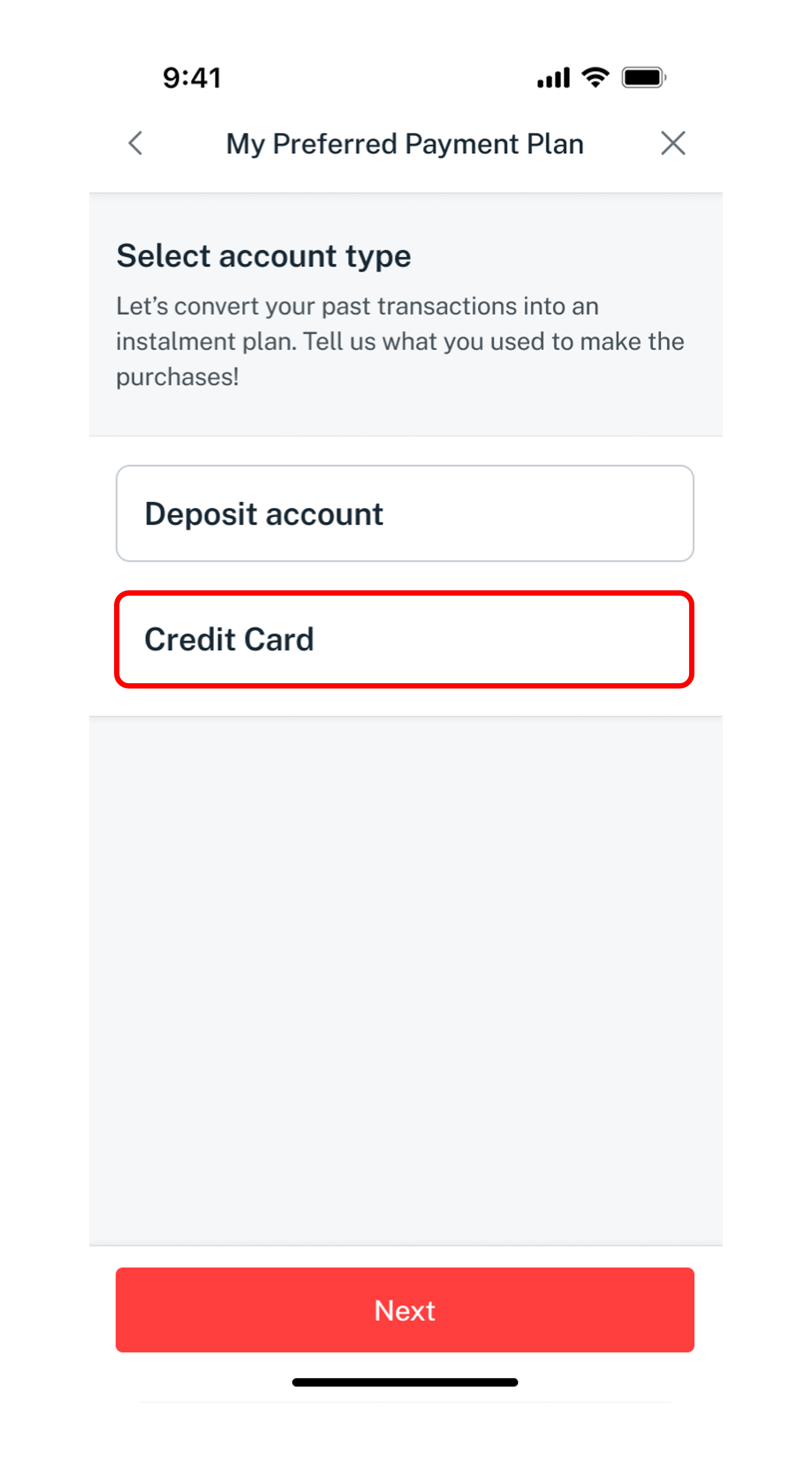 - Select Credit Card as your account type and click Next.