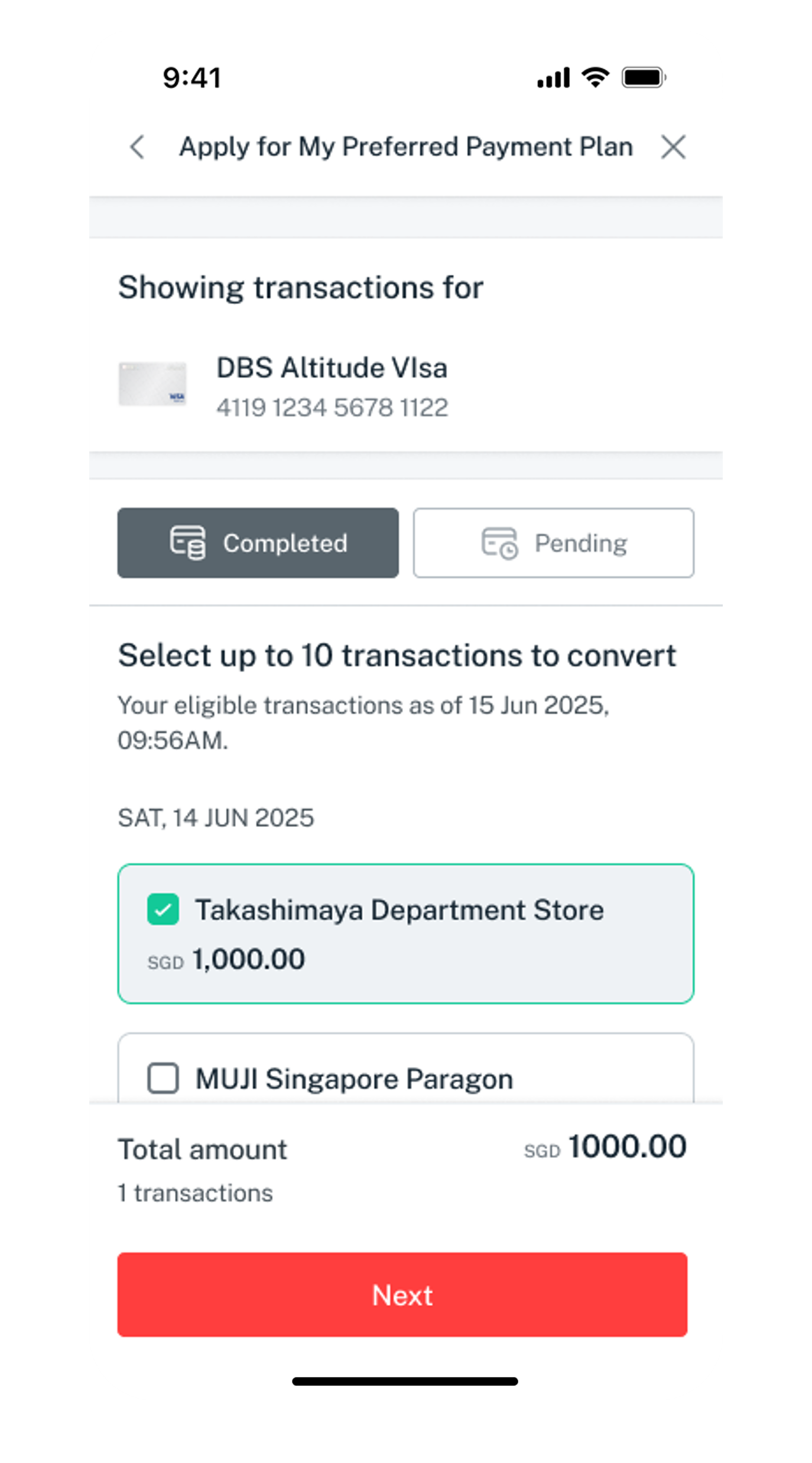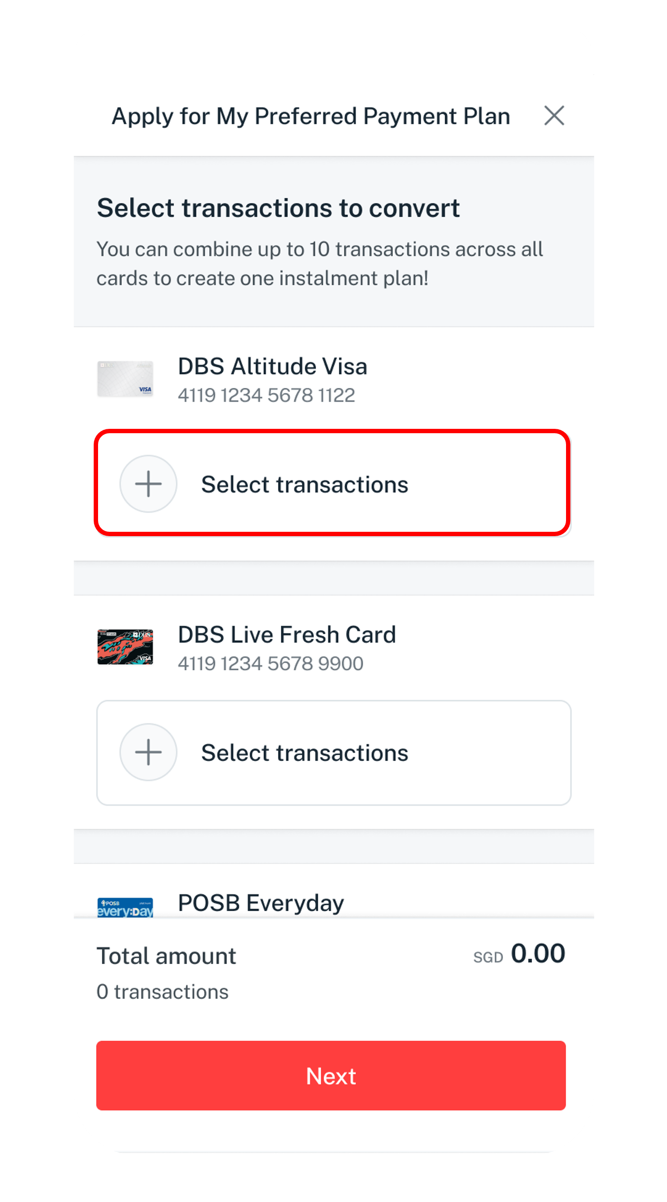 - Select the eligible transactions you wish to convert into instalments and click Next.