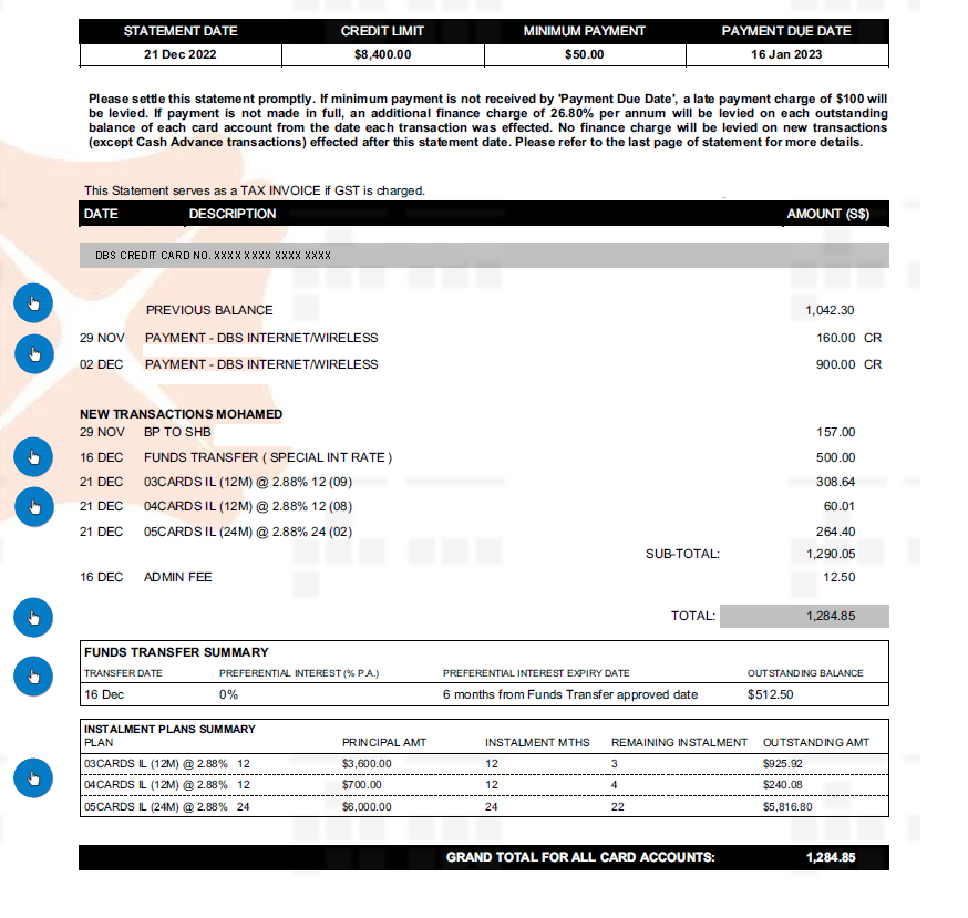 Minimum payment amount is calculated at 3% of your statement balance (or S$50, whichever