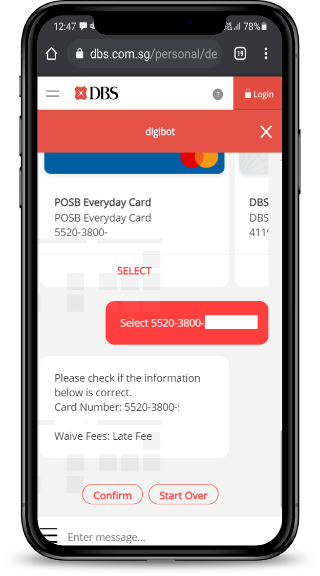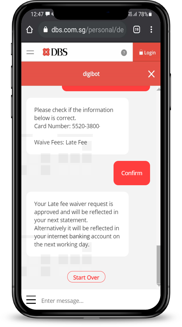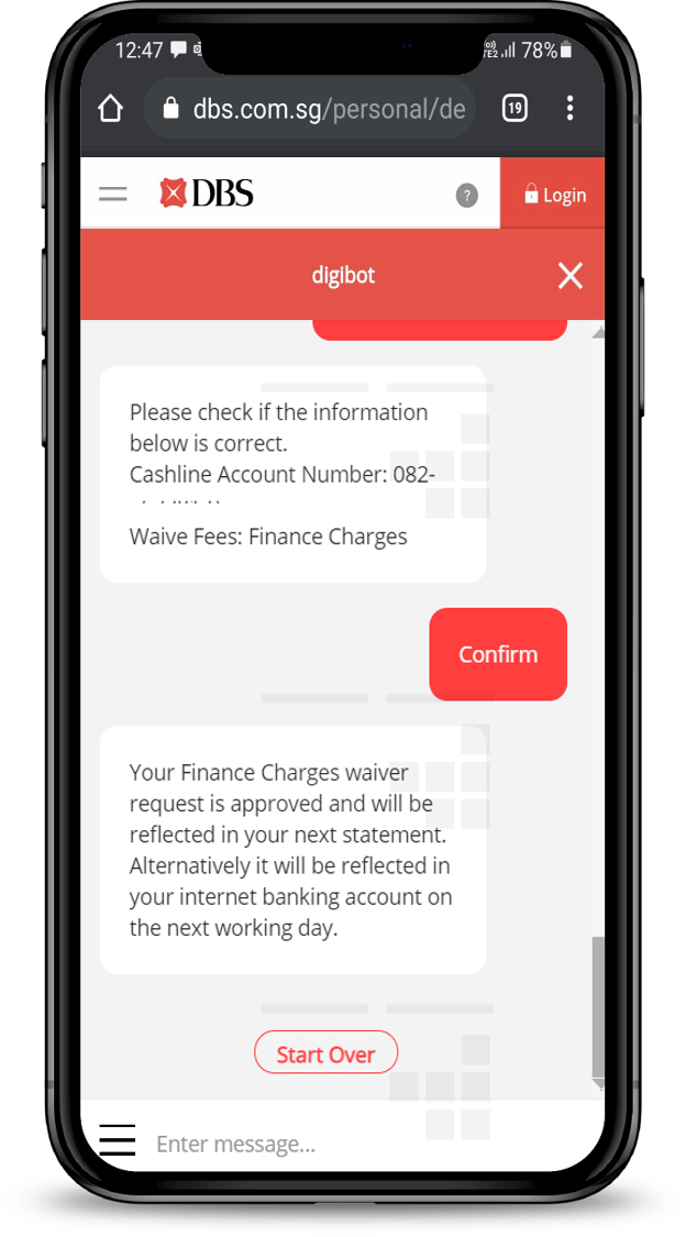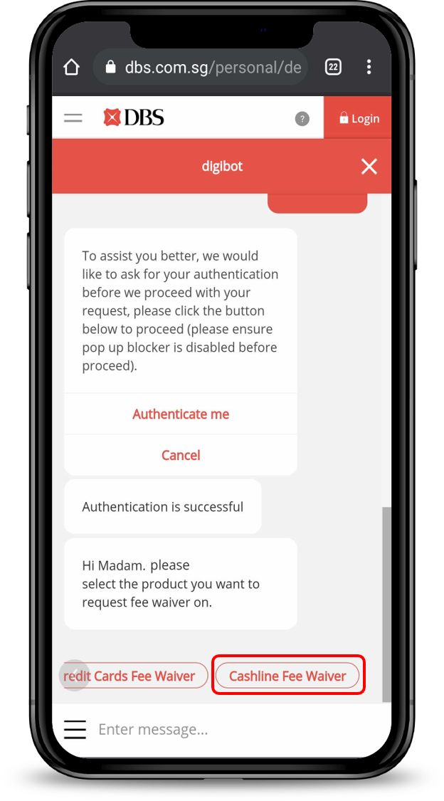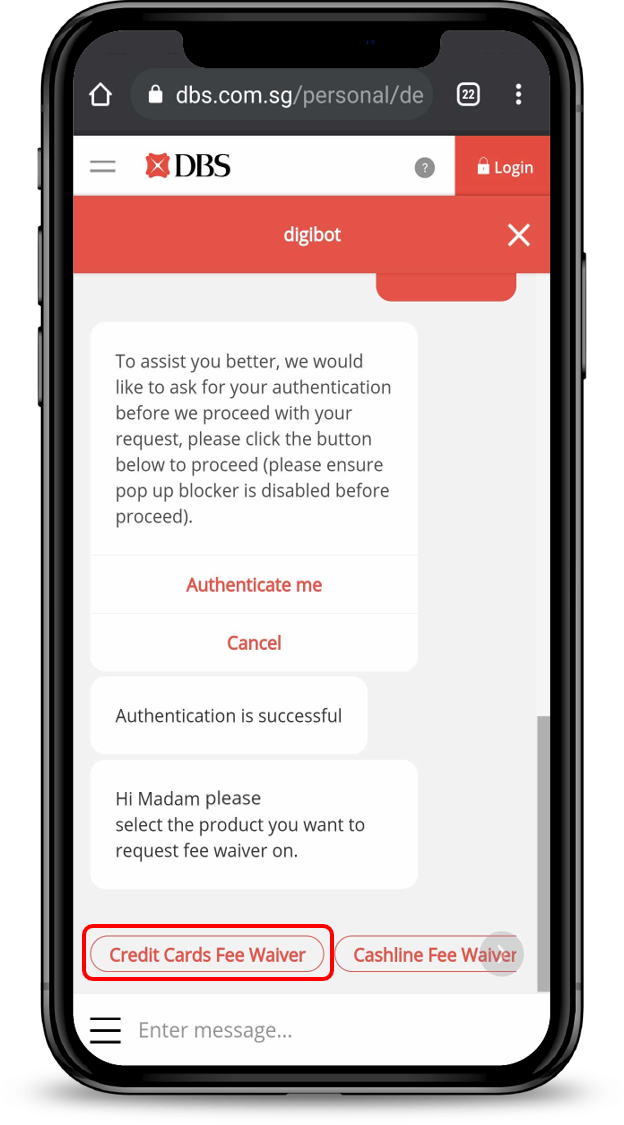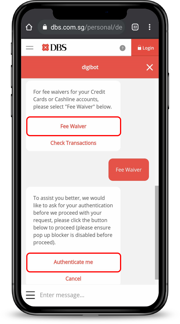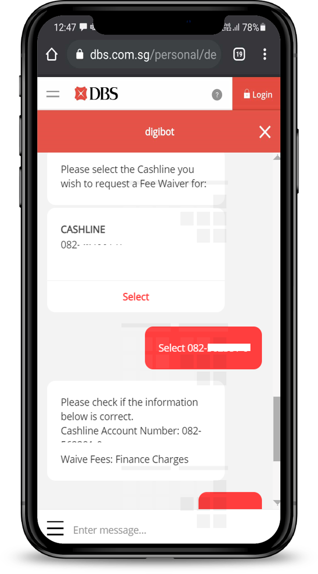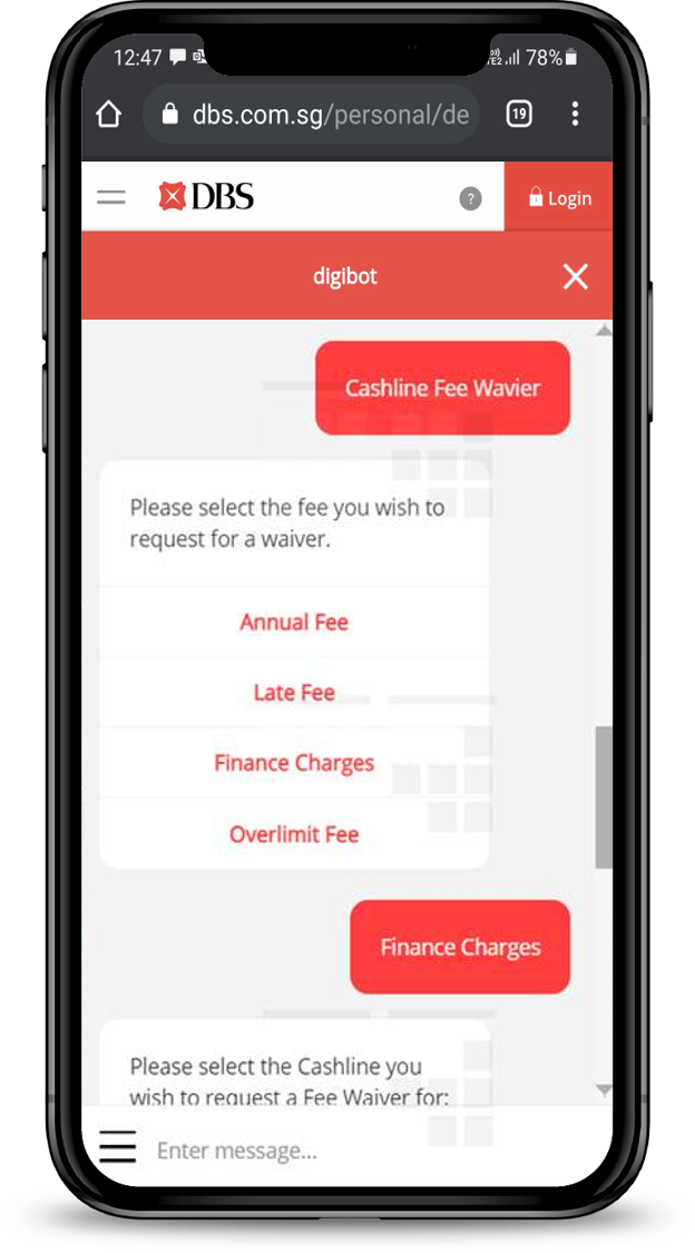 There are various channels through which you may request a waiver of your Credit Card / Cashline Fees & Charges with us. The most convenient method would be via DBS digibot.