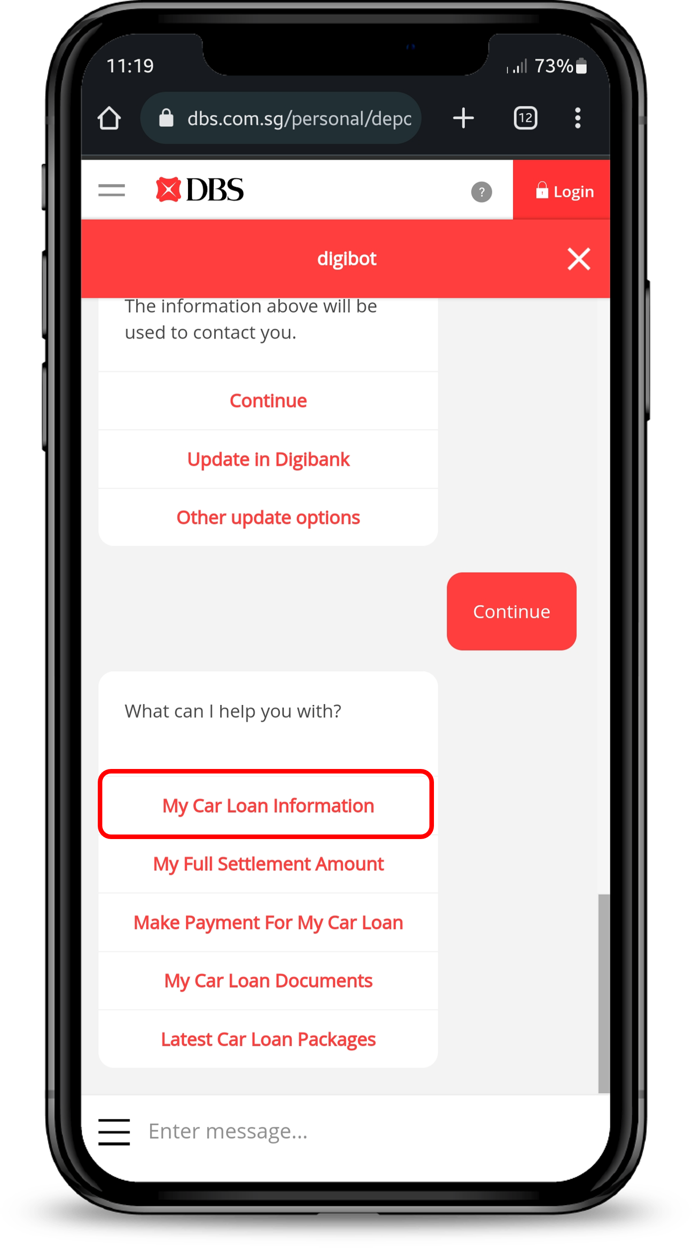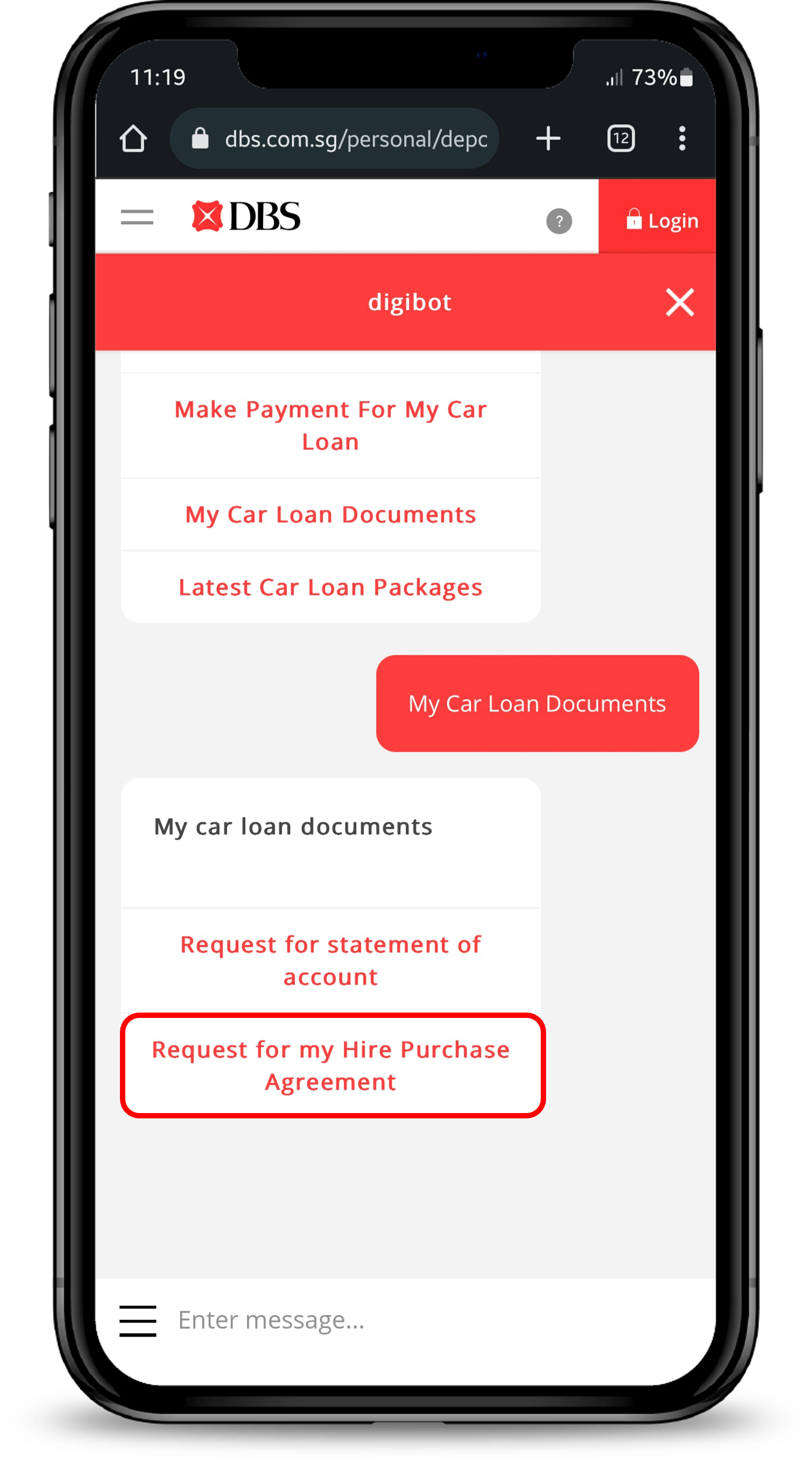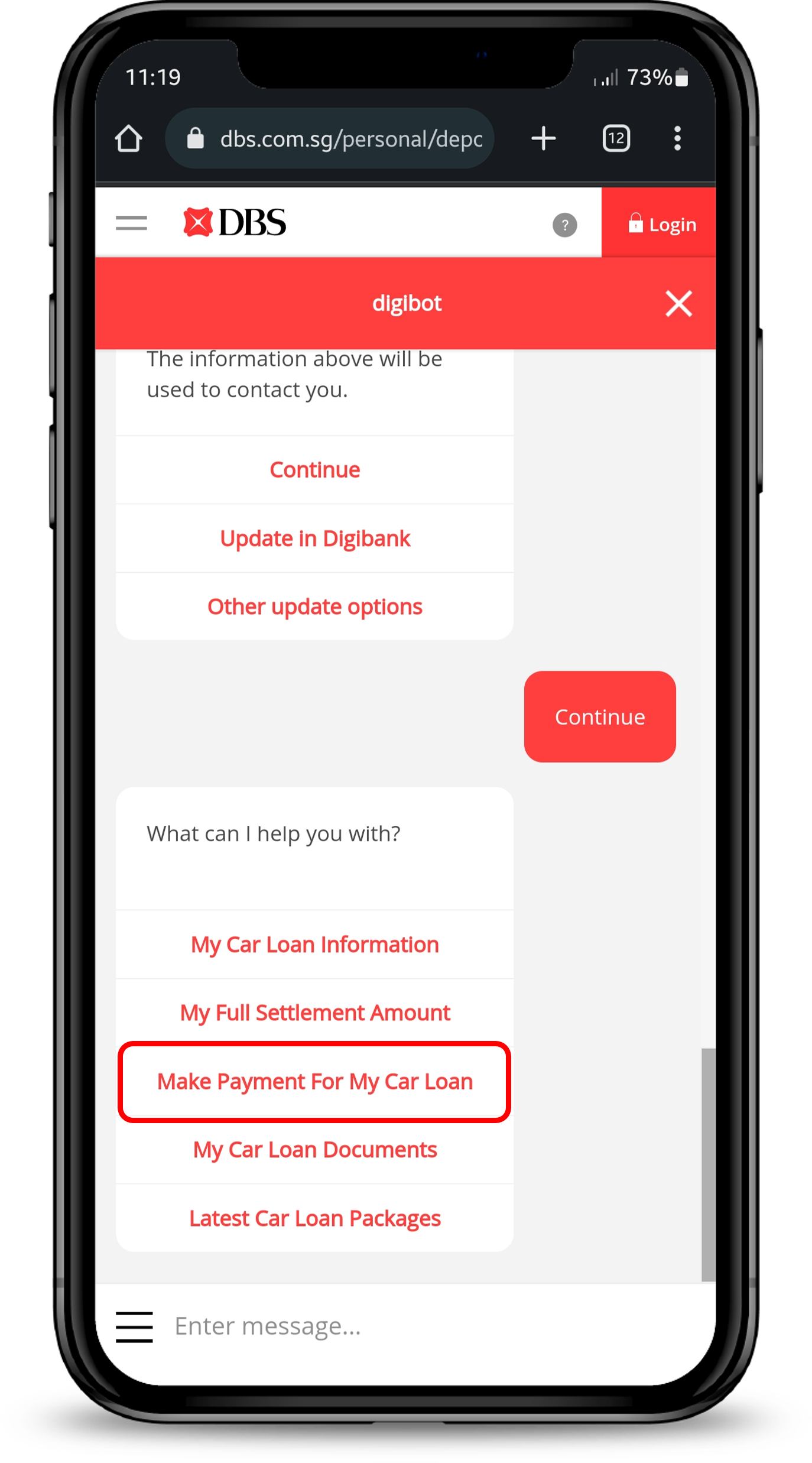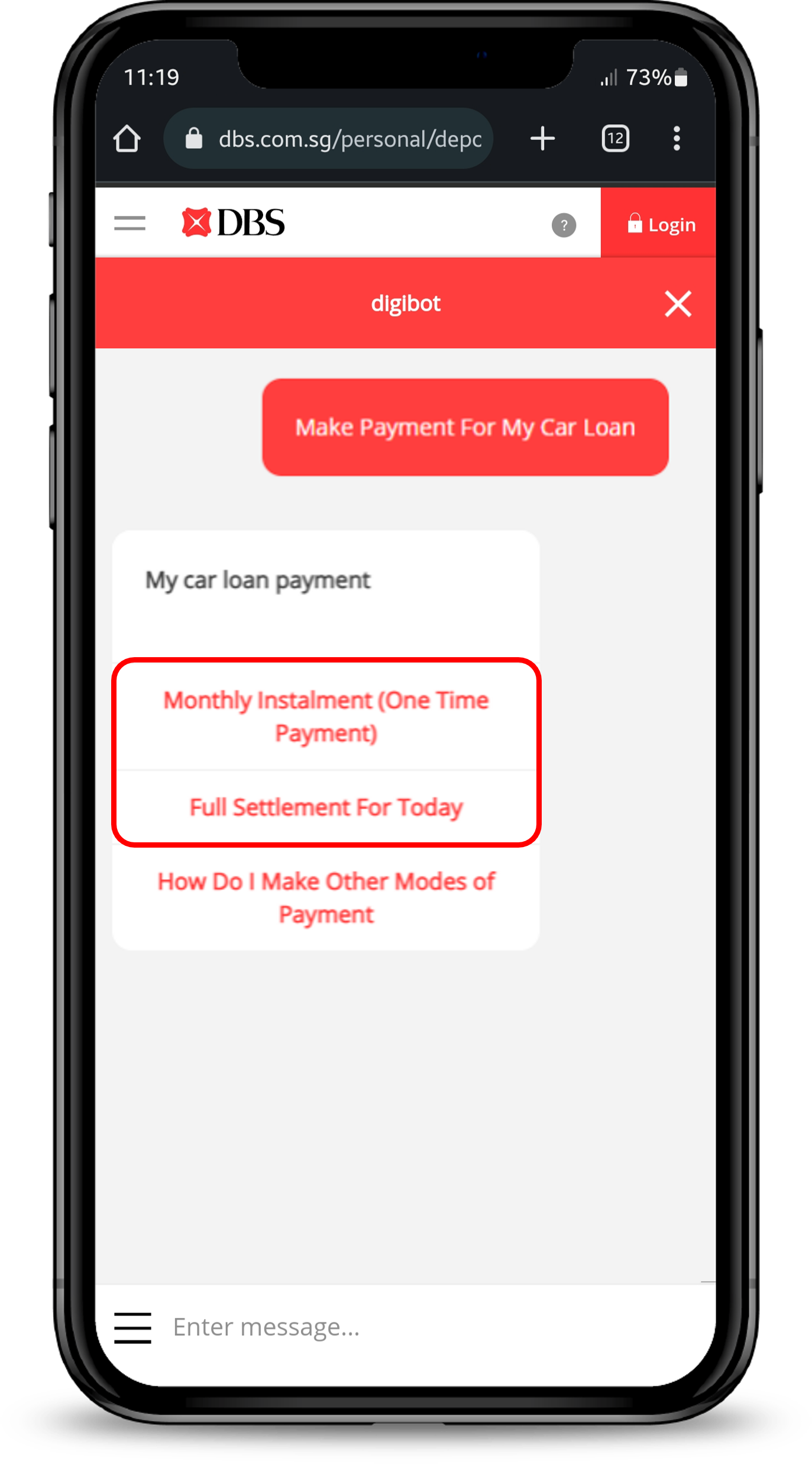There are various channels which you may repay your car loan with us. The most convenient method would be via DBS digibot.