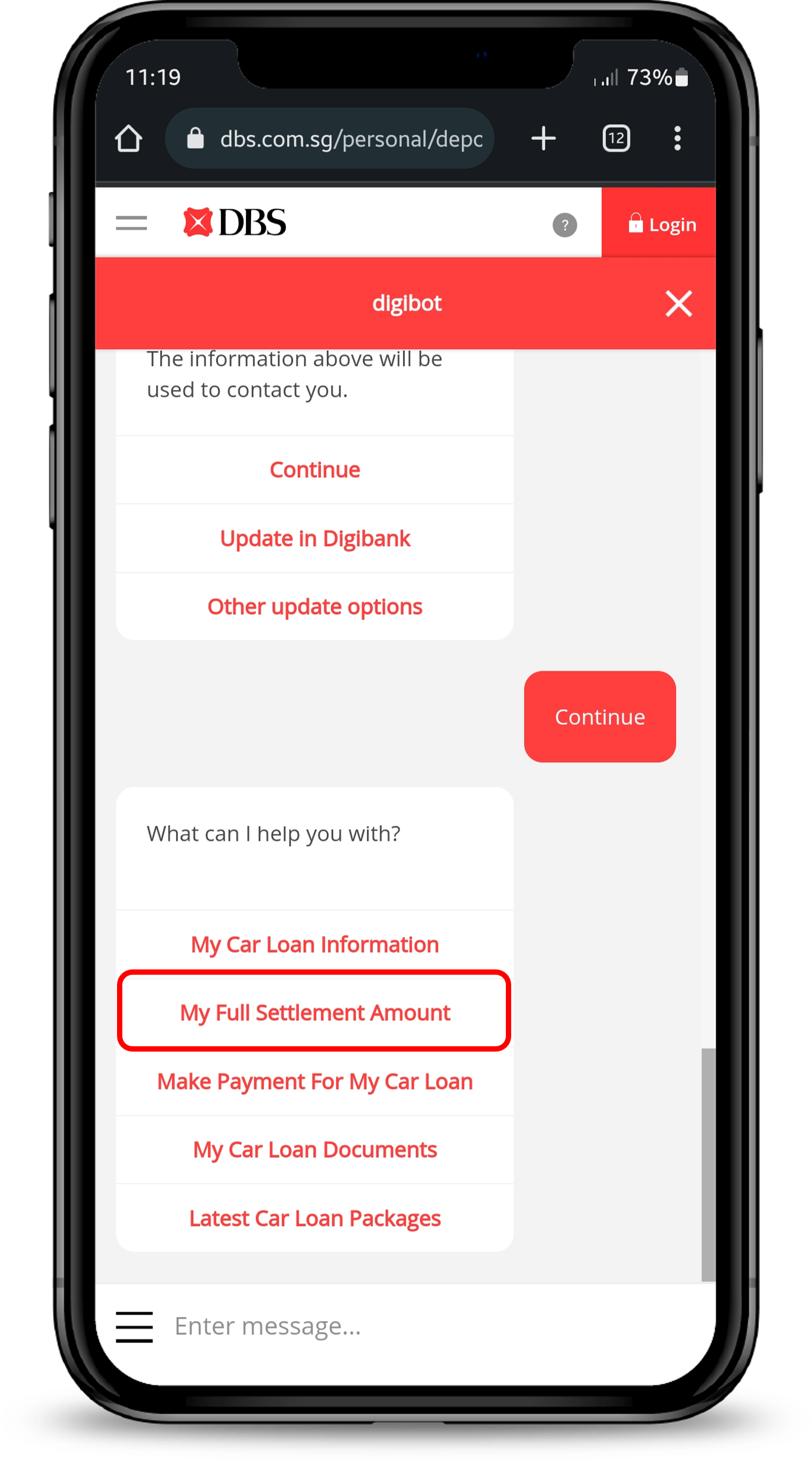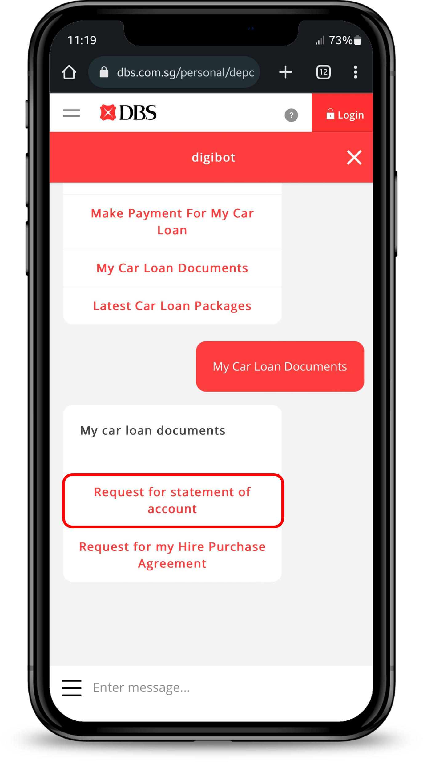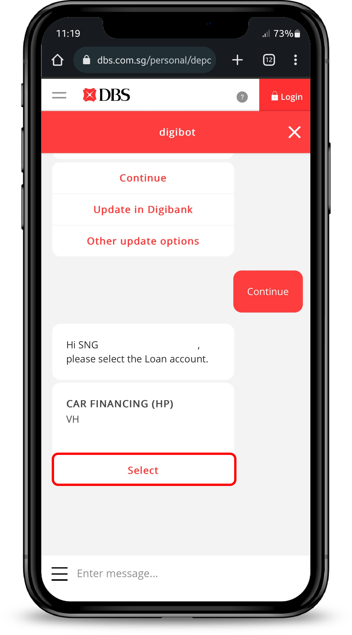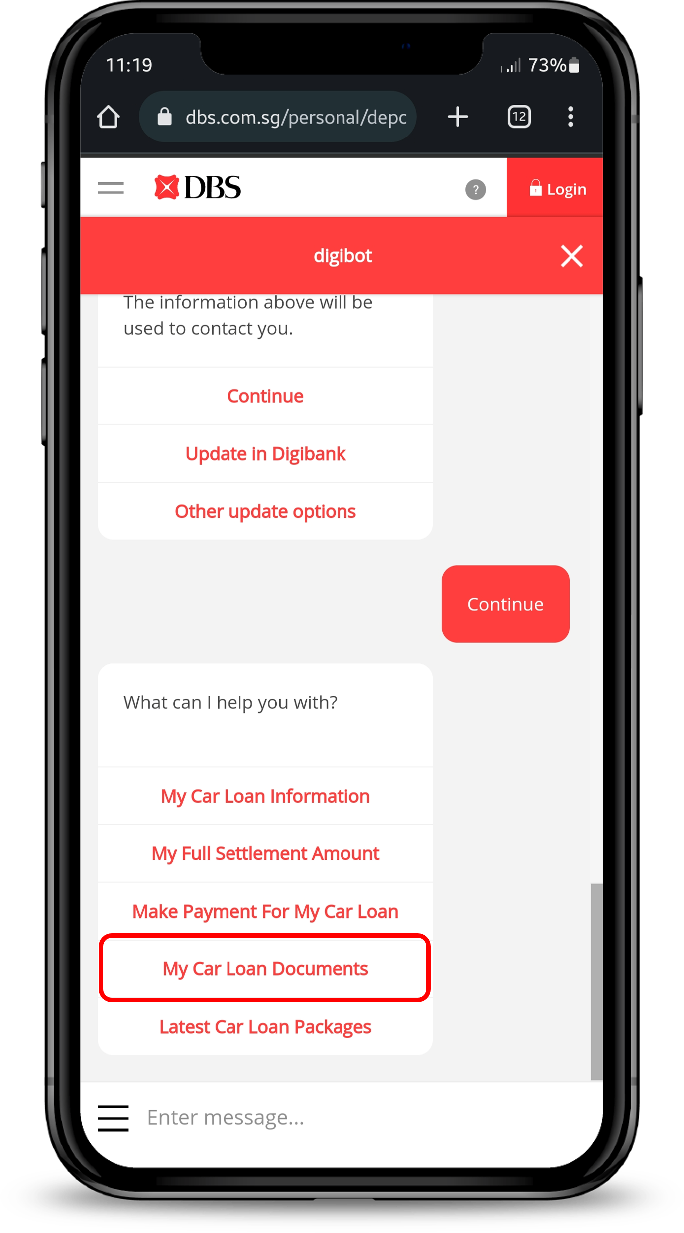 There are various channels which you may repay your car loan with us. The most convenient method would be via DBS digibot.